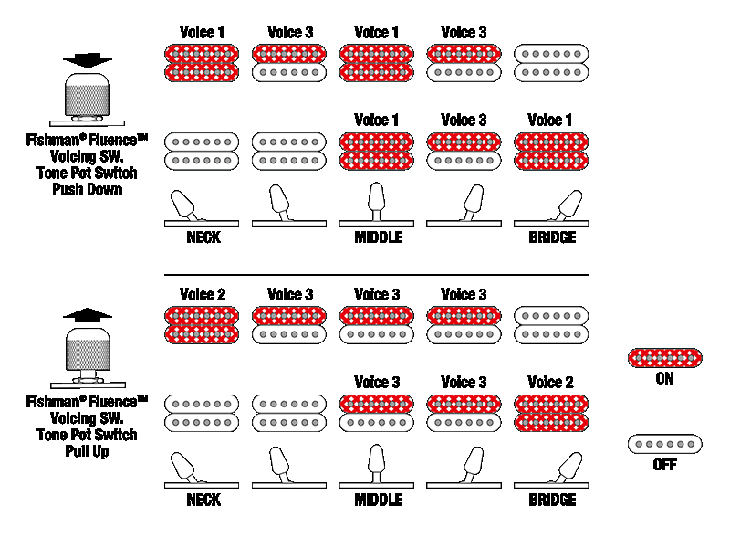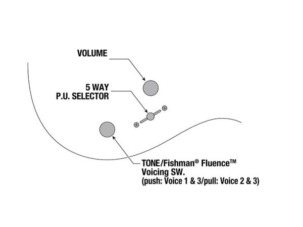 トーン・ノブのプッシュ/プル操作によって、ネック・ピックアップとブリッジ・ピックアップそれぞれ3通りの音色を変更することが出来る、Fishman Fluence Voicingスイッチ機能を搭載しています。