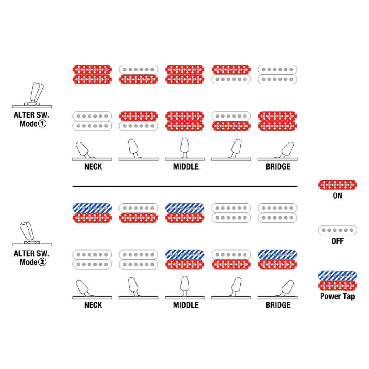 パワータップモードでは、片方のコイルを タップさせ、もう片方のコイルの低音域を 生かす特殊配線が施された、ただのタップ では得られないクリアな高音域と太くて輪 郭のハッキリしたサウンドが特徴です。 限られた機材で一人何役もこなさなければ ならない現代のギター・プレイヤー向きのス イッチング・システムです。