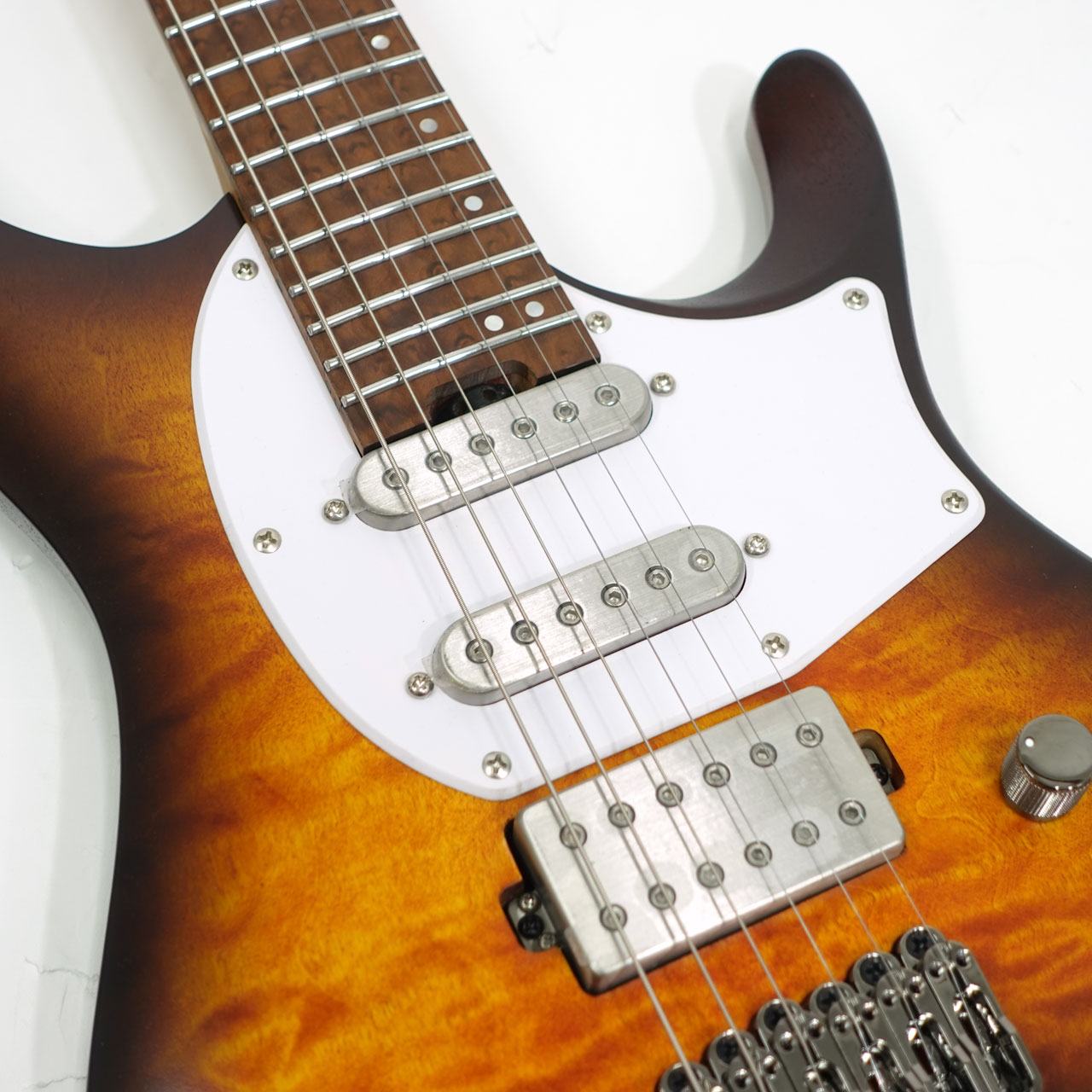 ローステッドメイプルとブビンガの硬質な3Pネックにローステッドバーズアイメイプル指板を採用、ネックシェイプは様々な演奏スタイルに対応できる厚すぎず薄すぎない、馴染みやすいネックです。フレットにはジャンボステンレスフレットを採用し高い耐久性を持ちます。