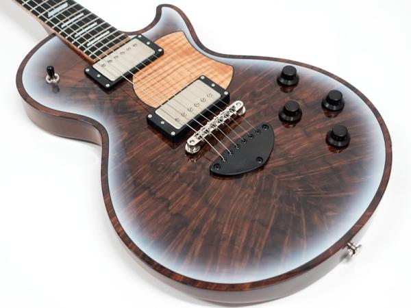 外周のウッドバインディングの仕上げ、エボニーウッドノブ、カーリーメイプルピックガード、ブラックダイヤモンドブリッジと他の追随を許さぬ匠の技が随所に光る仕上がりは高い所有感を演出してくれます。