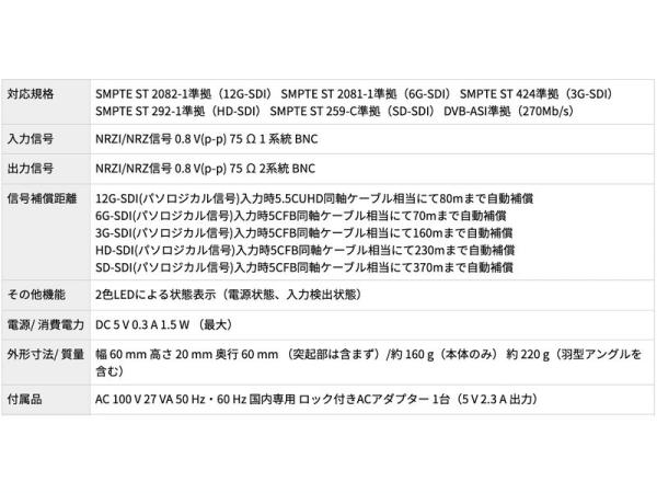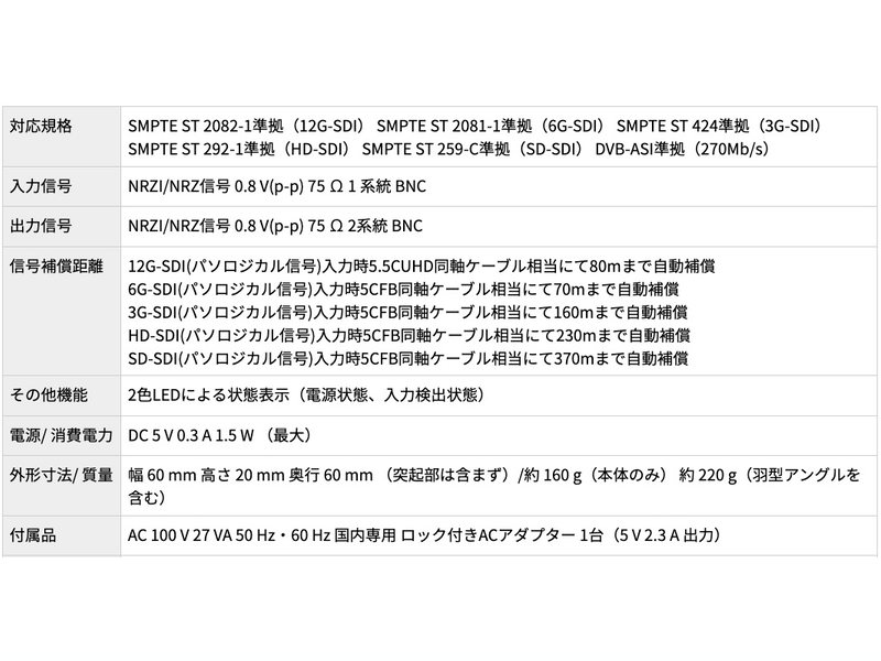 SMPTE ST 2082-1準拠(12G-SDI) SMPTE ST 2081-1準拠(6G-SDI) SMPTE ST 424準拠(3G-SDI) SMPTE ST 292-1準拠(HD-SDI) SMPTE ST 259-C準拠(SD-SDI) DVB-ASI準拠(270Mb/s) |