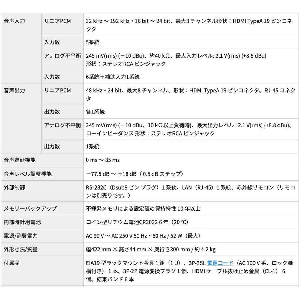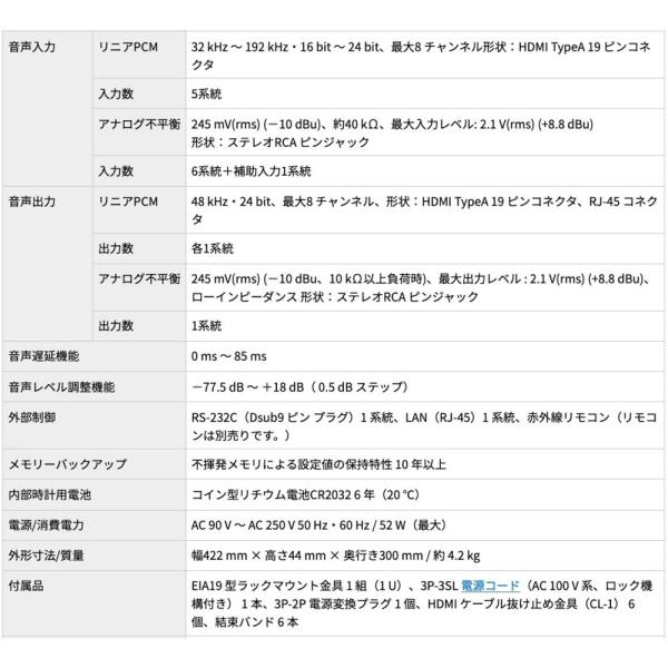 48 kHz・24 bit、最大8 チャンネル、形状:HDMI TypeA 19 ピンコネクタ、RJ-45 コネクタ |