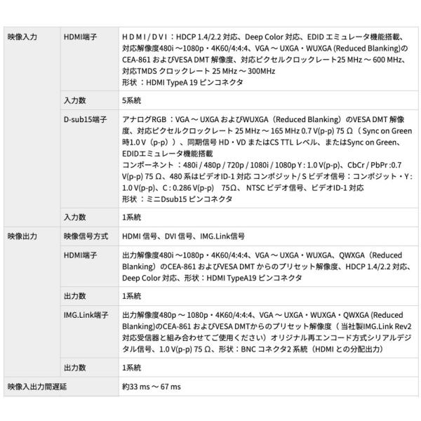出力解像度480p ~ 1080p・4K60/4:4:4、VGA ~ UXGA・WUXGA・QWXGA (Reduced Blanking)のCEA-861 およびVESA DMTからのプリセット解像度( 当社製IMG.Link Rev2 対応受信器と組み合わせてご使用ください)オリジナル再エンコード方式シリアルデジタル信号、1.0 V(p-p) 75 Ω、形状:BNC コネクタ2 系統(HDMI との分配出力) |