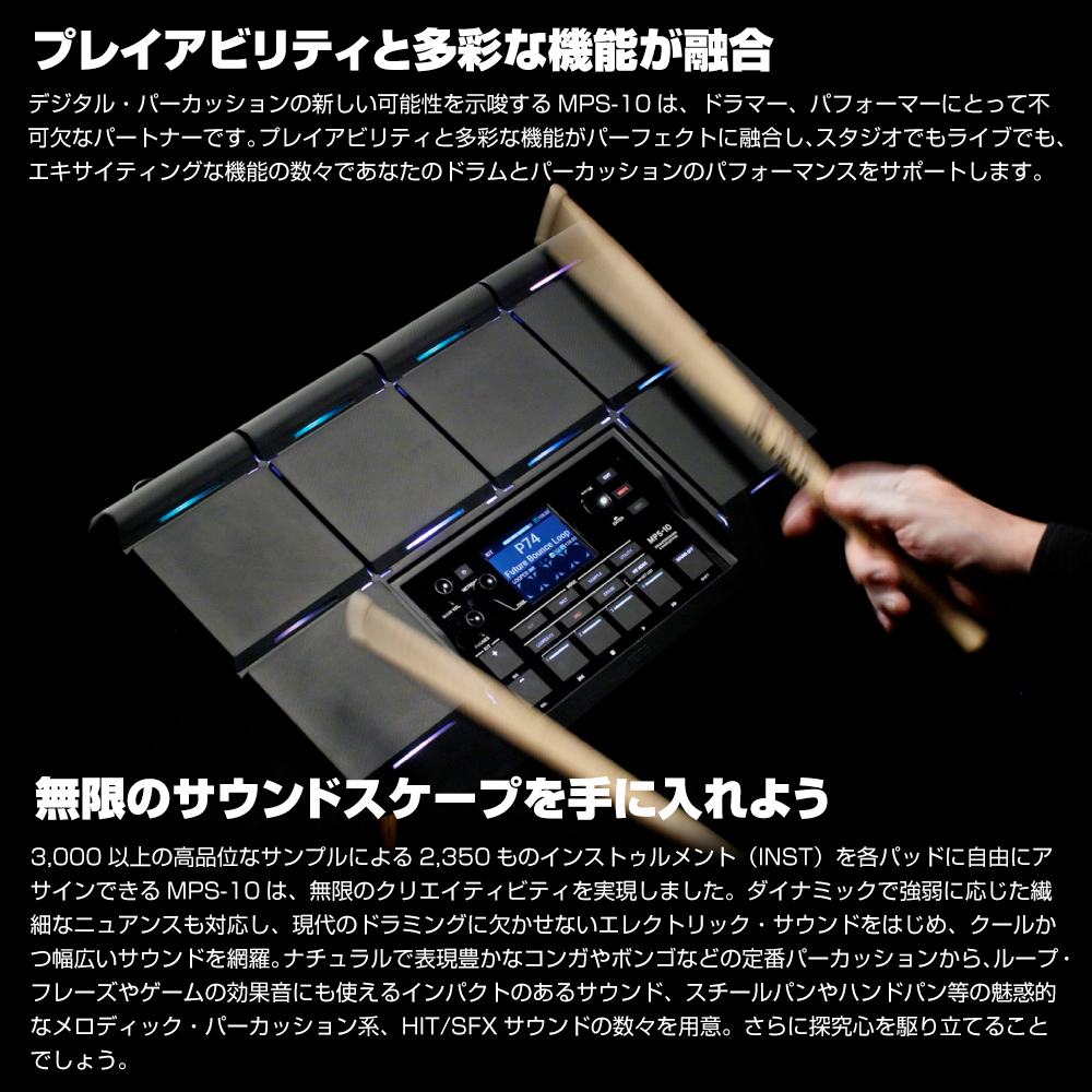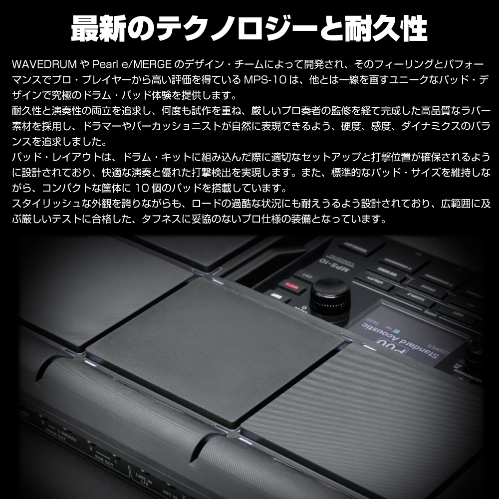 デジタル・パーカッションの新しい可能性を示唆するMPS-10は、ドラマー、パフォーマーにとって不可欠なパートナーです。プレイアビリティと多彩な機能がパーフェクトに融合し、スタジオでもライブでも、エキサイティングな機能の数々であなたのドラムとパーカッションのパフォーマンスをサポートします。
