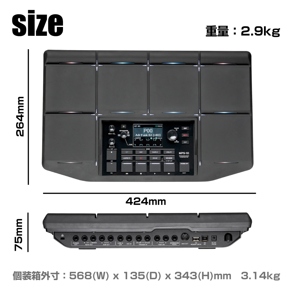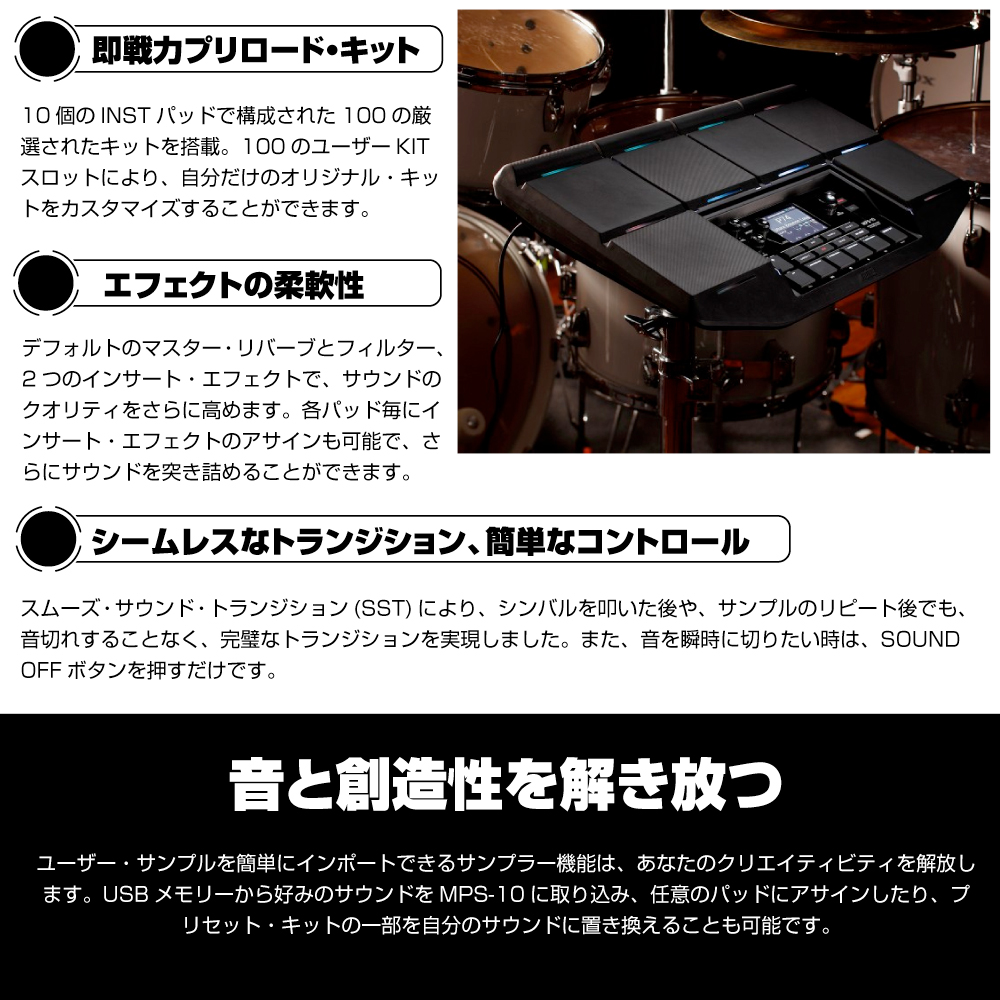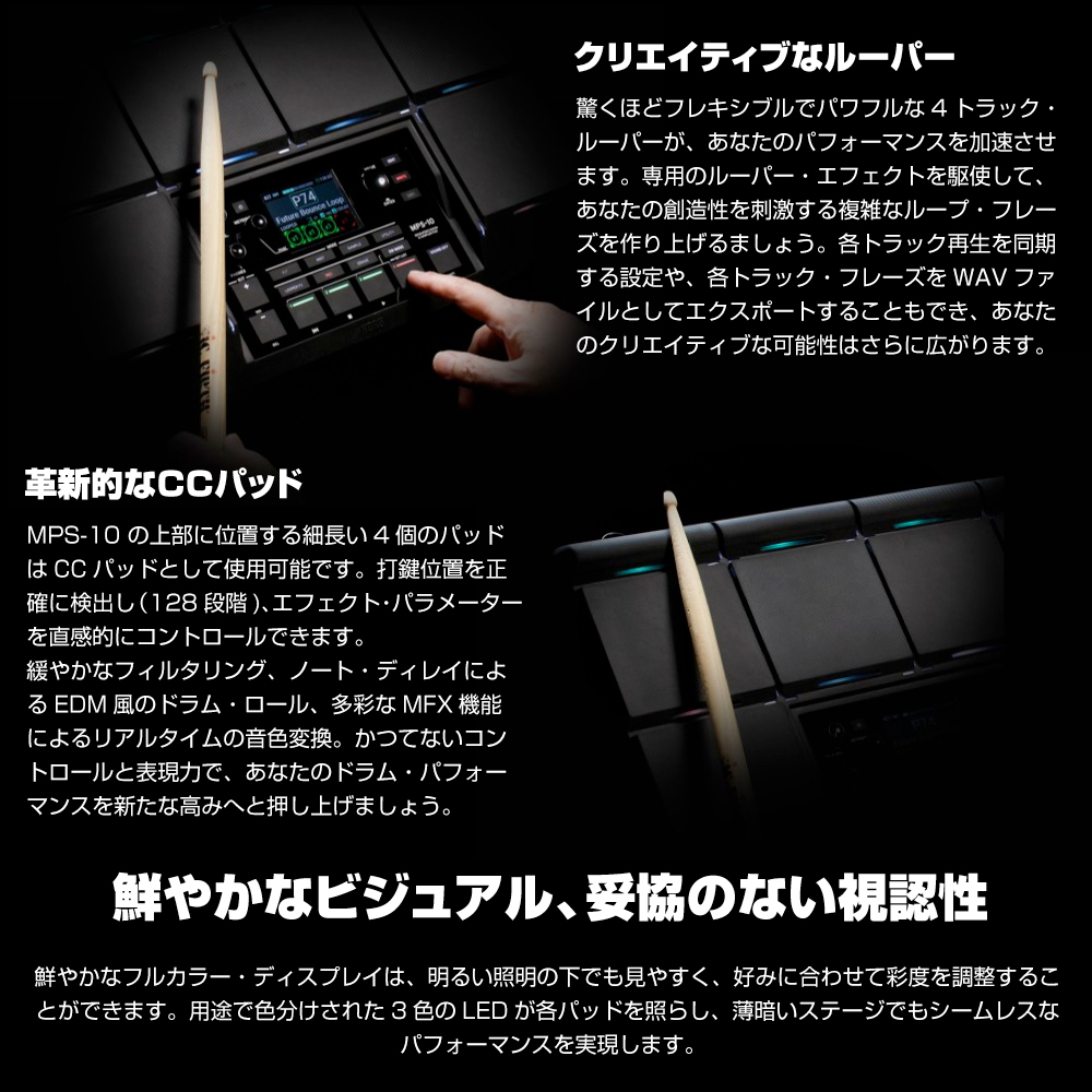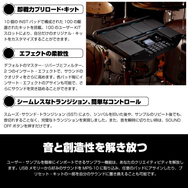 あらゆるドラマーやパーカッショニストの要望に応えるべく、新たな表現力を獲得したMPS-10は、10個のパッドを筆頭に、多彩なサンプラー機能、画期的な4個のCC(コンティニュエンス・コントロール)パッド、最先端の4トラック・ルーパー等、これらすべてがシームレスに統合。外部トリガー・インプット、フットスイッチやエクスプレッション・ジャックも搭載し、拡張性も兼ね備え、パフォーマンスをさらに加速させます。