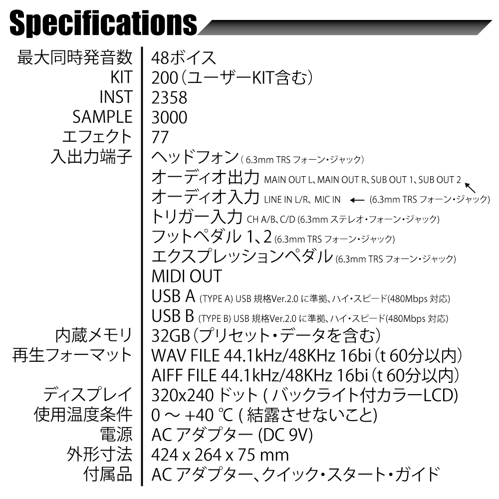付属品:AC アダプター、クイック・スタート・ガイド