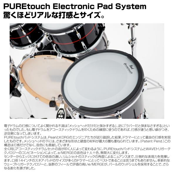 75年以上の歴史を持つPearlのアコースティック・ドラム製造の卓越した技術とKORGの先進的な電子技術を完璧に融合したe/MERGEは、本物の木材に高級感あふれるラッカー仕上げを施したタム、キック、スネアによって、リアルなアコースティック・ドラムのルックスに進化しました。従来のWAVEトリガー・テクノロジーによる音色のリアルさ、高速レスポンス、広いダイナミクスレンジや、PUREtouchパッド・システムの快適な打感はそのままに、それぞれのサイズ感を限りなくアコースティック・ドラムに近づけることで演奏性を遜色ないレベルにまで押し上げ、あらゆるプレイヤーのパフォーマンスを底上げします。