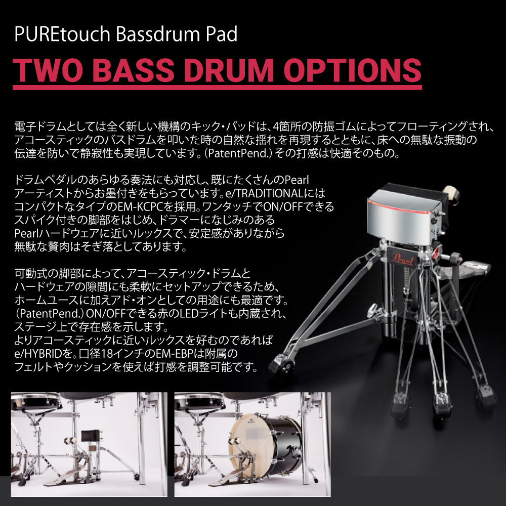 Pearlはアコースティック・ドラムを知りつくしているからこそ、 電子でアコースティックを100%再現することが不可能だとわかっています。 ただ同時に、従来の電子ドラムの枠を超え、アコースティック・ドラムとも違う、 新しい "楽器" を作れないかと、ずっと考えてきました。 KORGという最強のパートナーを得た今、その夢が現実のものに。 両社の知識と技術を"MERGE(マージ)" =融合”した、魔法のような作品、 e/MERGEが、ついに完成です。