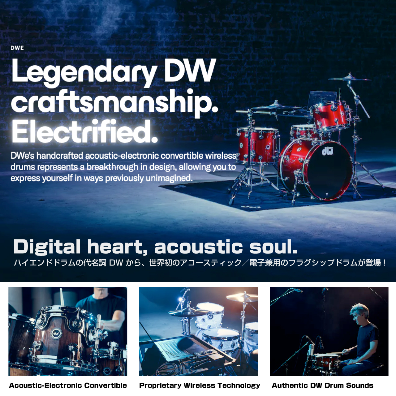 Drum Workshop(DW)は50年以上に渡り、アコースティック・ドラムの世界において、その信頼性とクラフトマンシップの高さでドラマーからの人気を築き上げてきました。この度、そのアコースティック・ドラムに自社の電子技術に加え、ローランドの長年に渡る電子技術、知見が融合し、全く新しいドラム「DWe」が誕生しました。