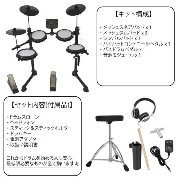 リアルな打感と消音性を両立したメッシュパッドを採用、スネアドラムはエッジのラバー部も感知するダブルトリガー仕様で、より本格的なドラムプレイを楽しみたい方に最適なデジタルドラムです。レコーディング機能や3種類のリズムキープトレーニングができるコーチモードなど、演奏が上手くなるためのアシスト機能も備えています。