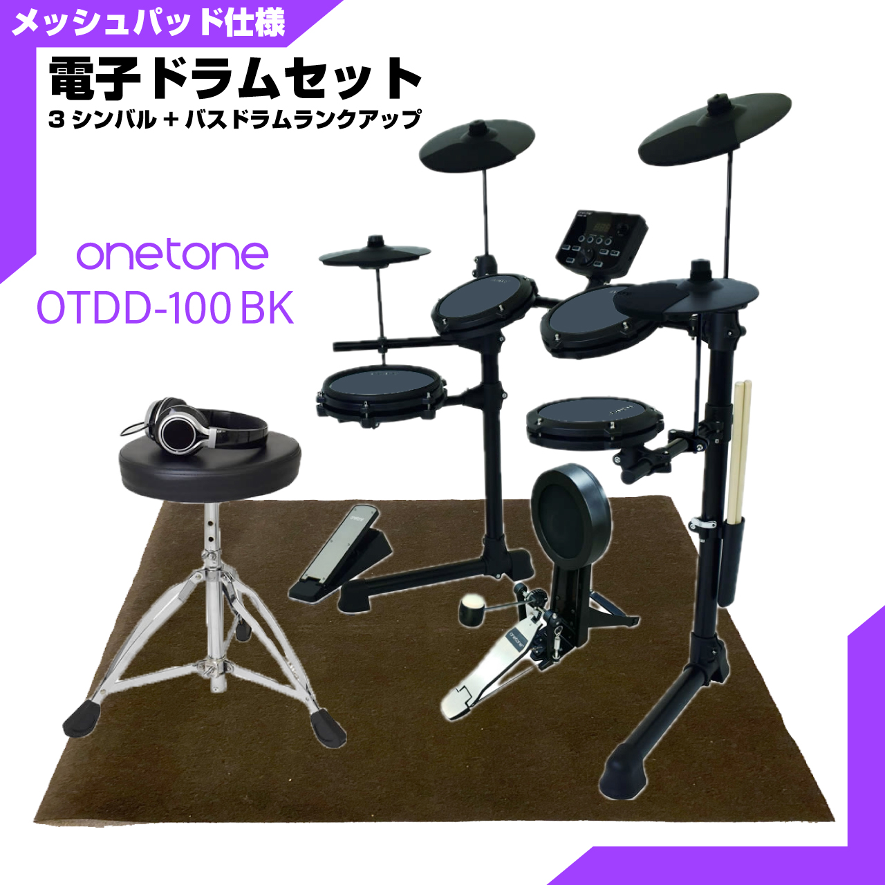 ONETONE ワントーン 電子ドラム メッシュ 安い ドラム OTDD-100 BK バスドラム ランクアップ 3シンバル仕様 マット付き