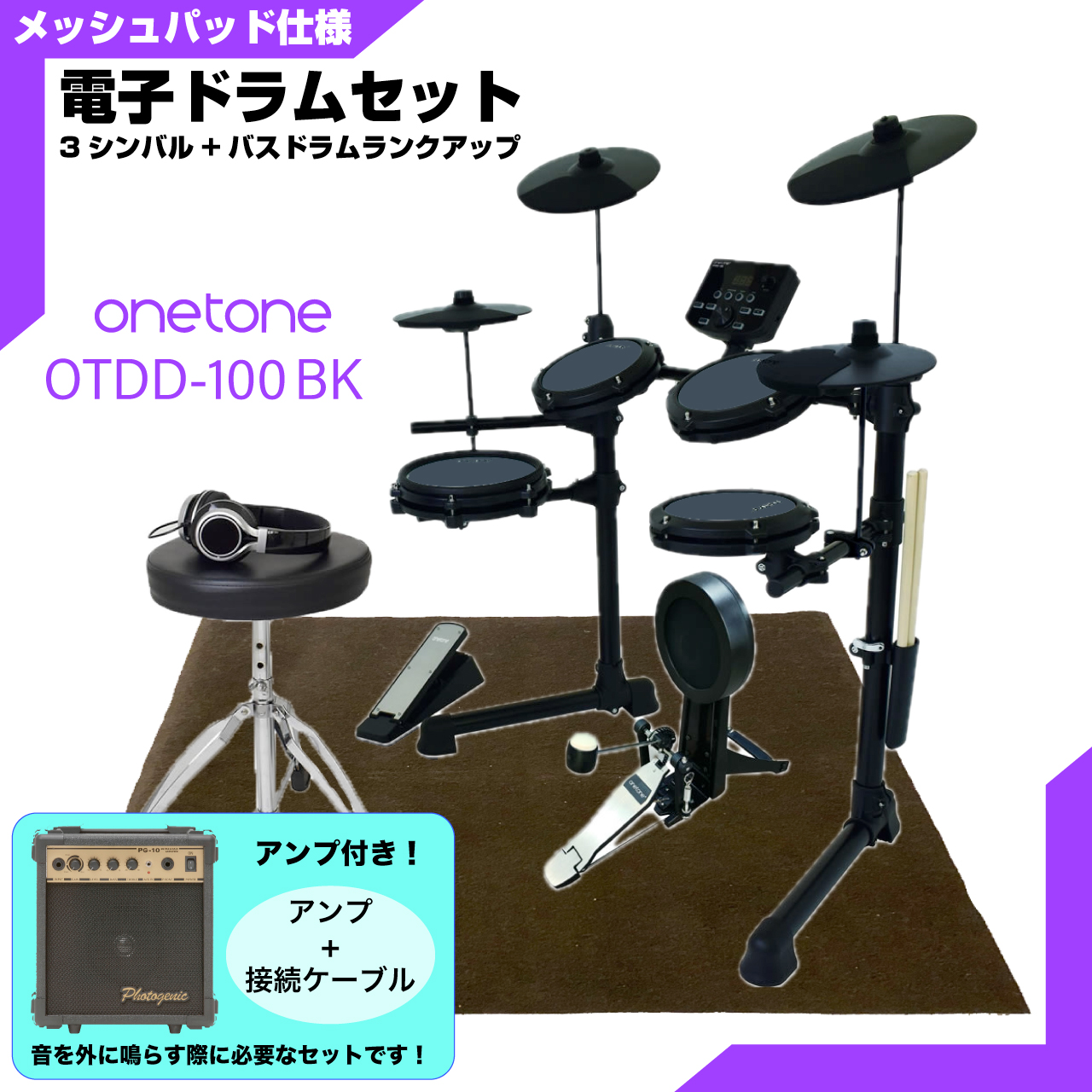 ONETONE ワントーン 電子ドラム メッシュ 安い ドラム OTDD-100 BK バスドラム ランクアップ 3シンバル仕様 マット付き アンプ付き