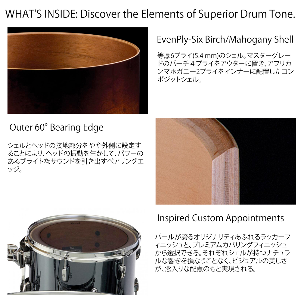 パールのフラッグシップモデルと同様なシェル成型が施され、過酷なリハーサルスタジオ環境においても、タフなつくりを元に信頼度の高いデザインを誇る。低域の豊かなアフリカンマホガニー、高域特性に優れるバーチを組み合わせてワイドな音域を実現している。