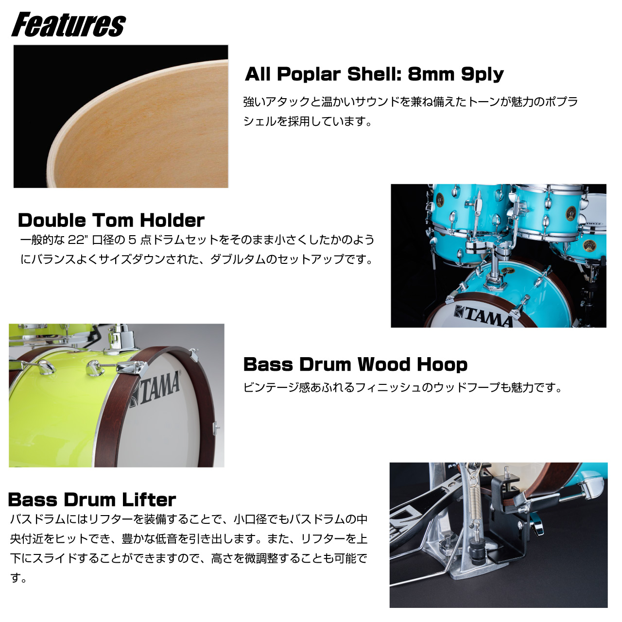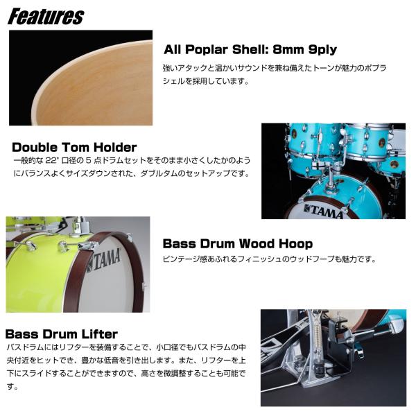 一般的な22"口径の5点ドラムセットをそのまま小さくしたかのようにバランスよくサイズダウンされた、ダブルタムのセットアップです。