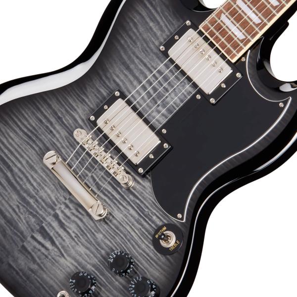 新たなラインナップのエントリーモデル、SGトリビュート。そしてボディトップにフレイムメイプルの化粧板、エボニーバーストカラーで1ランク上のルックスを実現。。