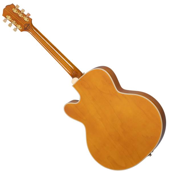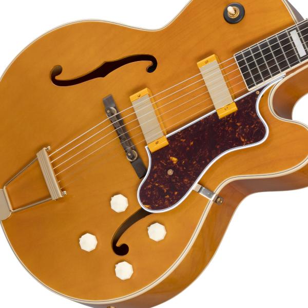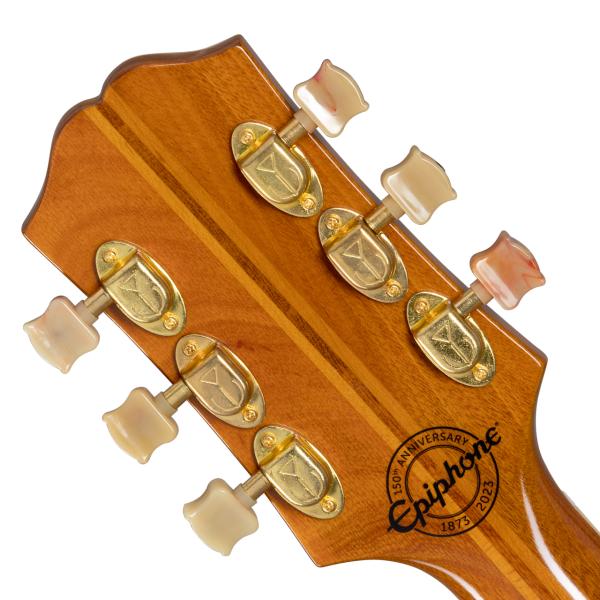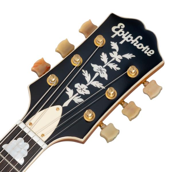 ジャズ、ブルース、ロカビリーに最適な本モデルは、ギターコレクター垂涎のヴィンテージ器の意匠を継承しつつ、現代のプレイヤーのニーズに合わせてアップデートが施され、フル・ホロウボディ構造で仕上げられています。ハイポジションへのスムーズな運指を実現するディープカッタウェイ、プレス加工により合板メイプルを成形したアーチトップ構造、メイプル/マホガニーの5 ピース構造による25.5 インチ・スケールのネックとエボニ指板等、拘りの仕様を誇ります。インレイについてはすべてマザーオブパールが使用されています。ヘッドストック上の歴史的な50 年代スタイルのエピフォン・ロゴ、ツリーオブライフのデザインによるヘッドストック・インレイ、そしてポジションマーカーには歴史的なエピフォン・クラウド・インレイのデザインを採用。エレクトロニクス部分について、2 基のEpiphone NY Mini Humbuckerピックアップを搭載。各ピックアップはそれぞれのヴォリューム・コントロールとトーン・コントロールを備え、CTS製のポテンショミータ に結線されています。ヘッドストックの裏側には― 150周年記念の文字が刻まれ、製品にはエピフォン150周年記念ヒストリック・ハードシェルケースが付属となります。