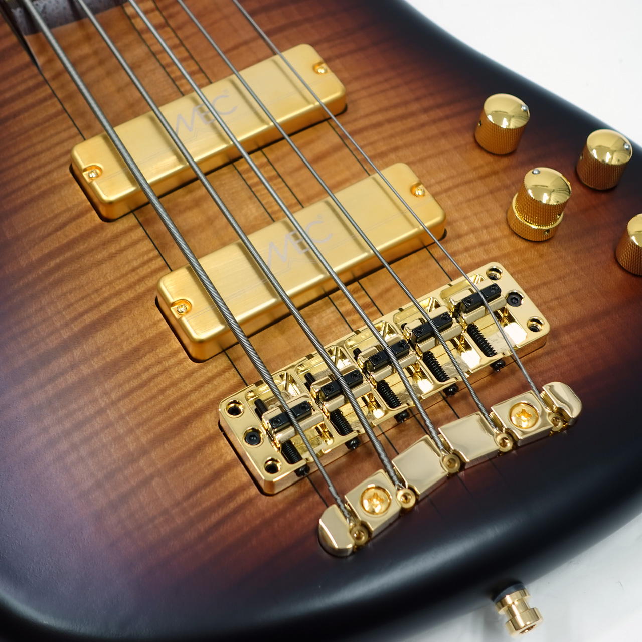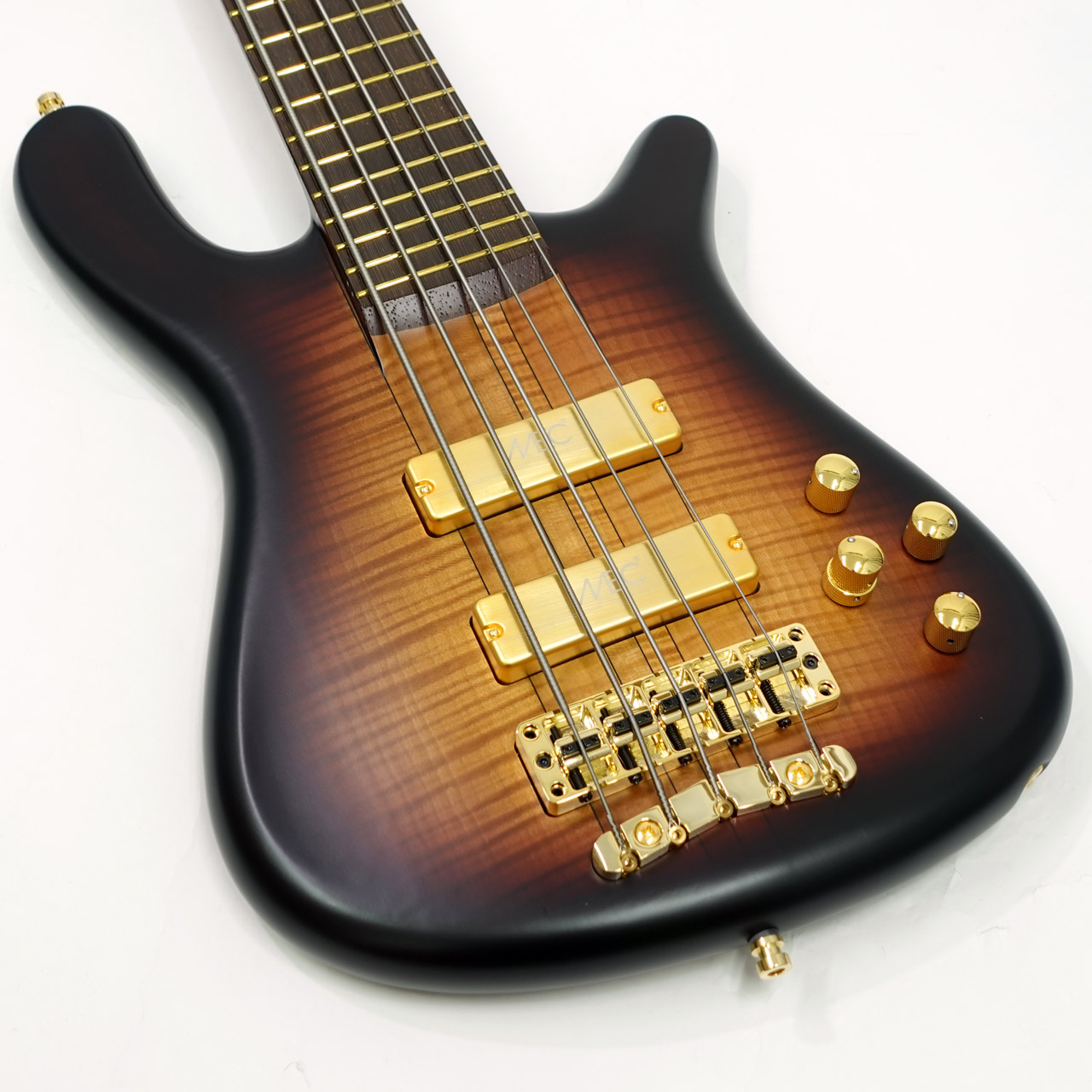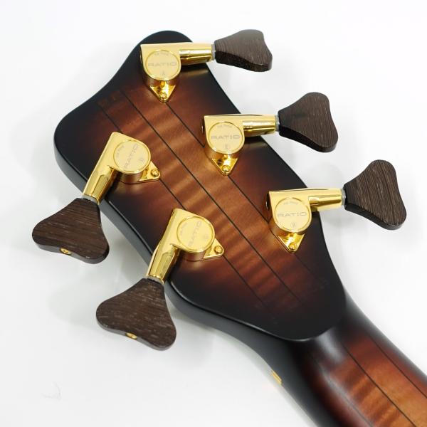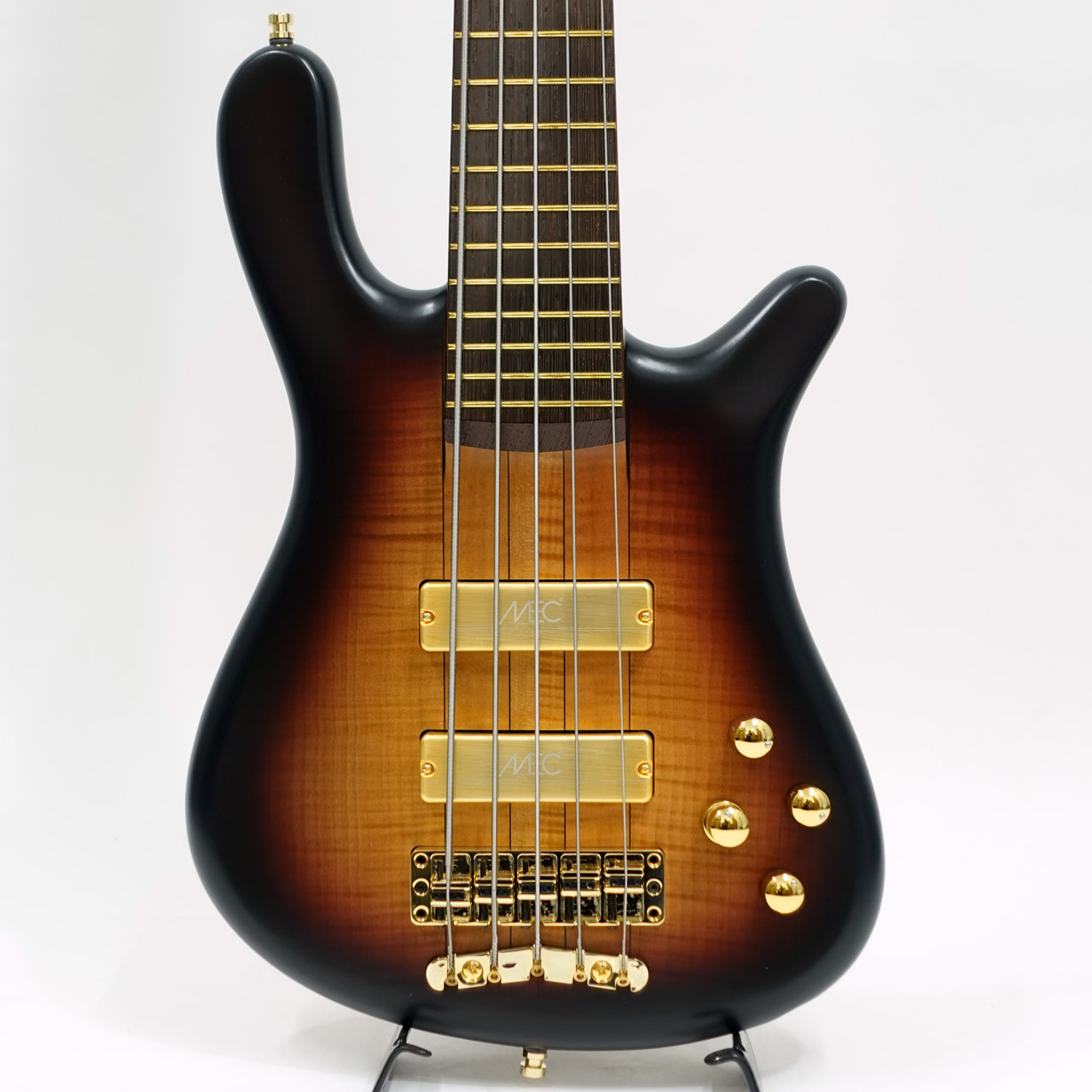 AAAフレイムメイプルボディ、フレイムメイプルネック&ウェンジ指板のスルーネック仕様、ゴールドパーツ。