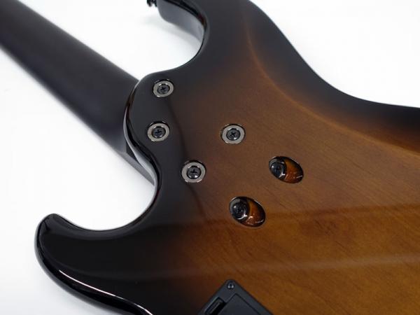 ボディ裏面から垂直にネックを固定する4本のネジに加え、ボディ裏から45度の角度でネックエンドを固定する2本のネジを追加したマイター・ボルティング方式を採用。ボディとネックを強固に密着させ、ボディとネックが一体となった強烈な鳴りを生み出します。通常のボルトオンジョイントよりも弦振動のエネルギーロスが少なく、豊かなサスティンと圧倒的な胴鳴りを実現します。