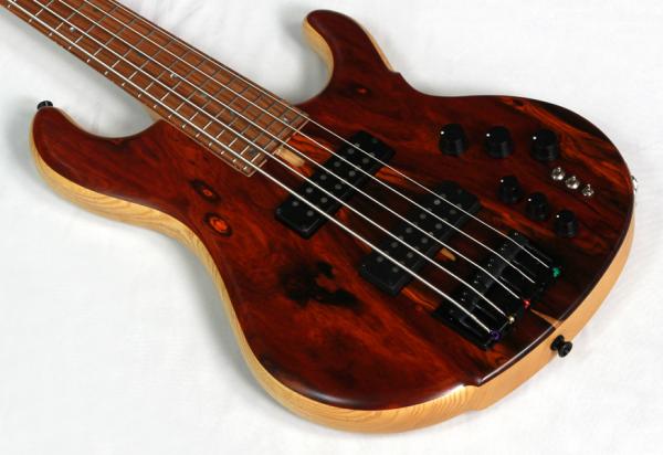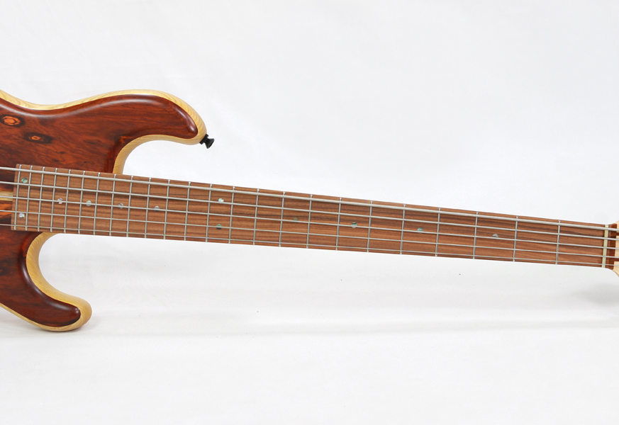 本モデルはボディに希少で杢目のエキゾチックなココボロをボディバックにはライトアッシュを採用した5弦ベース。ハーフマットフィニッシュにより杢目の美しさが引き立つ極上の仕上がりとして完成度の高いものになっています。
