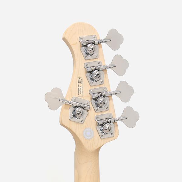 サーキットはアクティブ仕様となっており、ボリューム/バランサー/トレブル/ベースのコントロール構成。手元で直感的にサウンドを作り込むことができ、プレイスタイルやジャンルに応じた柔軟な音作りが可能です。バランサーでフロント・リアピックアップの出力バランスを調整し、トレブル/ベースの2バンドEQで音の輪郭や太さをコントロール。また、ボリュームとバランサーの間にはプリアンプのON/OFFスイッチも搭載されており、パッシブ的な使い方にも対応。エフェクターやアンプ側で音作りをする方にとっても安心の仕様です。