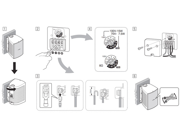 商業空間用サーフェスマウントスピーカーVSシリーズは、ローインピーダンス接続とハイインピーダンス接続の両方に対応した全天候型スピーカーです。ローインピーダンス接続・ハイインピーダンス接続の切り替え、およびハイインピーダンス接続時のワット数切り替えはリアパネルのタップで容易に行うことができます。また、屋外軒下での設置が可能な防水性能IPX3(防雨型)に準拠しており、シンプルかつスタイリッシュなキャビネットは様々な空間にマッチします。