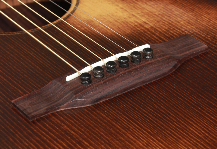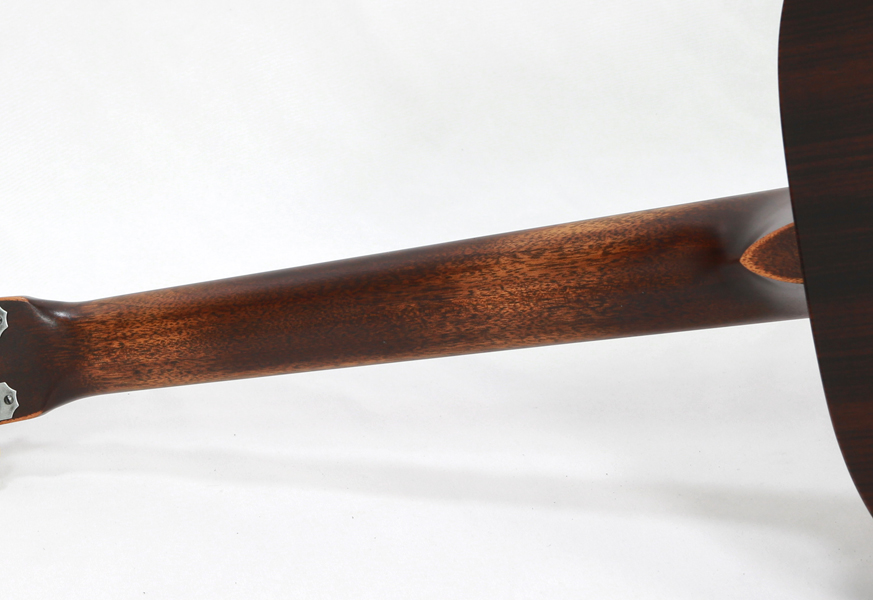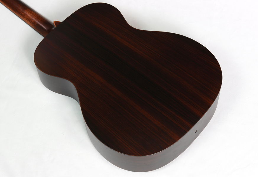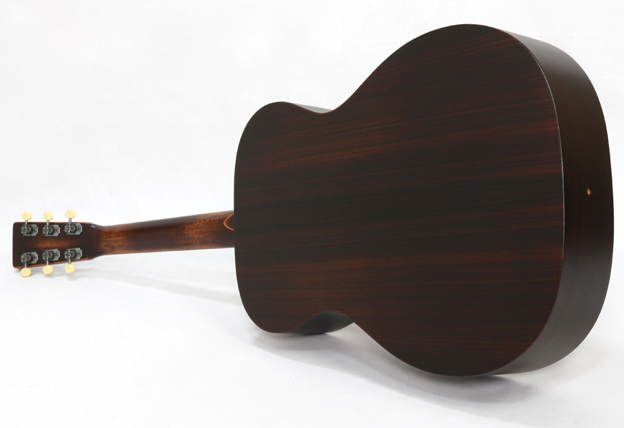 サイドバック材にはインディアンローズウッドを合わせており、音域が広く、豊かなローエンドと硬質なプレーン弦の響きが持ち味。サテンフィニッシュなので艶感や高級感は28に適いませんが、その分素朴でダイレクトに響くウッディなトーンが非常に魅力的です。