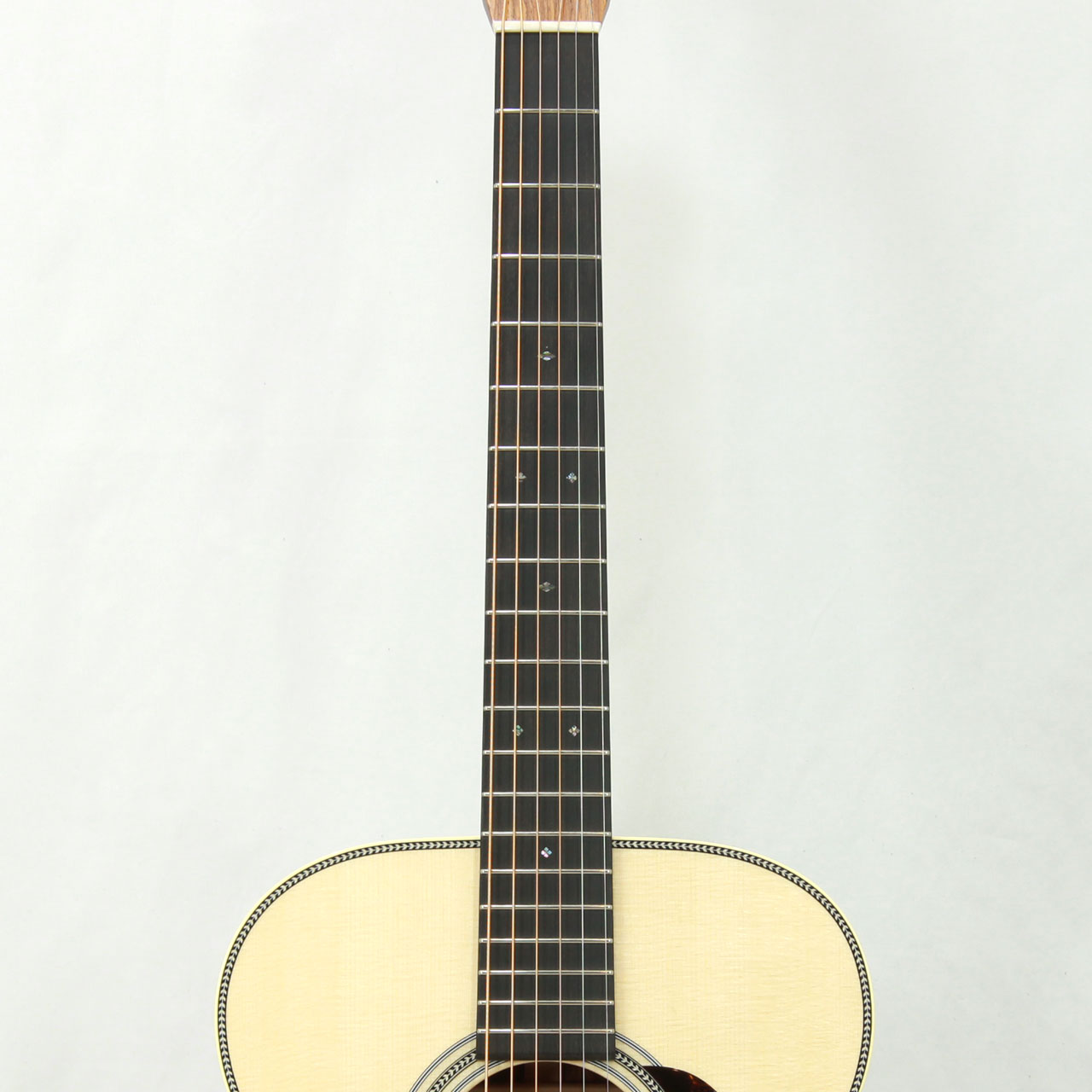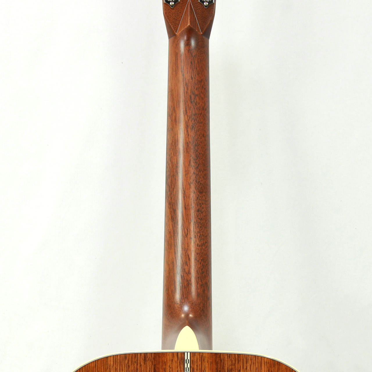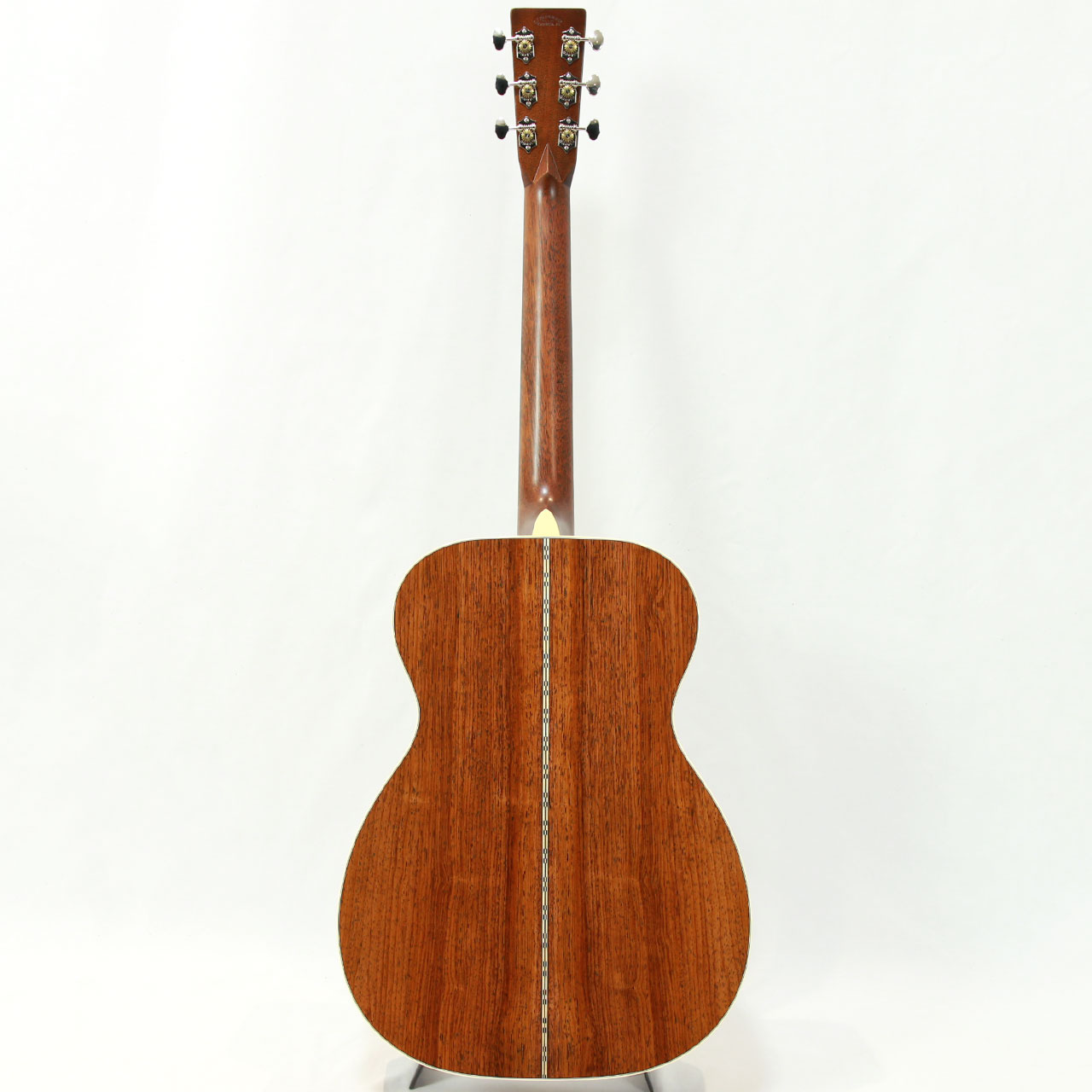 その他スペックとして、マホガニー材ネック、エボニー材指板&駒、アディロンダックスプルース材ブレイシング( Xブレイシング・スタンダードスキャロップド)、ナット幅は44.5mmのModified Low Ovalプロファイルネック、シルバーカラーのMARTINオールドスタイル・デカール、ヘリンボーントリム&ロゼッタ、ダイアモンド&スクエア指板インレイ、Grover V97ペグ、ロングサドルと、ルックスにも一捻りを加えさせて頂き、モダンで整ったルックスになるようオーダーしております。