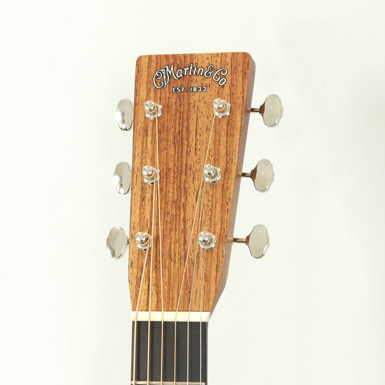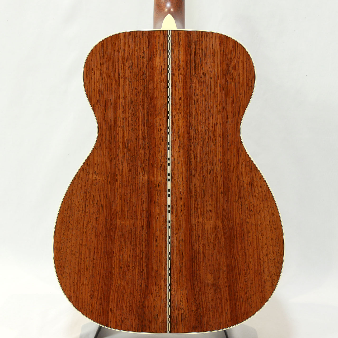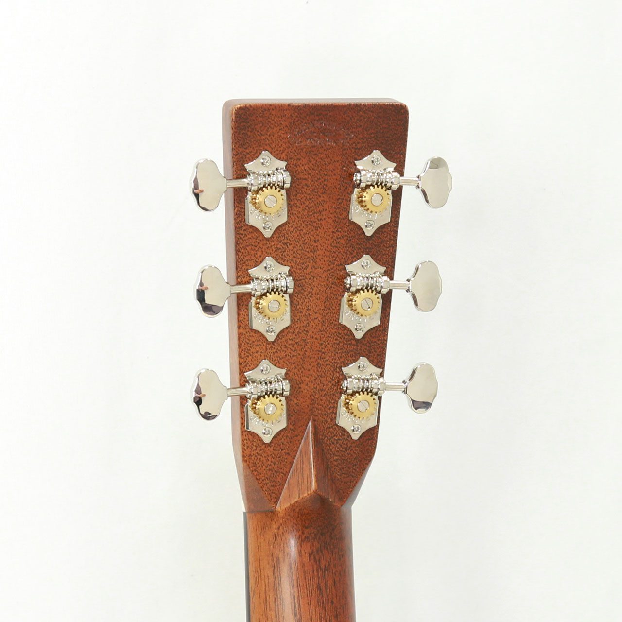 その他スペックとして、マホガニー材ネック、エボニー材指板&駒、アディロンダックスプルース材ブレイシング( Xブレイシング・スタンダードスキャロップド)、ナット幅は44.5mmのModified Low Ovalプロファイルネック、シルバーカラーのMARTINオールドスタイル・デカール、ヘリンボーントリム&ロゼッタ、ダイアモンド&スクエア指板インレイ、Grover V97ペグ、ロングサドルと、ルックスにも一捻りを加えさせて頂き、モダンで整ったルックスになるようオーダーしております。