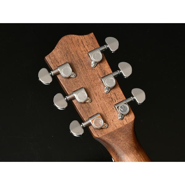 さまざまなボディシェイプやトーンウッドの組み合わせを試し、その中でわたなべゆうの得意とする演奏スタイルである温もりと透明感を併せ持つフィンガースタイルに最もフィットするカッタウェイ付きのHOCシェイプを採用。ハイフレットも弾きやすい仕様に仕上がりました。デザイン面では往年の愛機であるHeadway HDC-1020 “King Fisher”のデザインを落とし込みカワセミが魚をとる姿がヘッドから指板にかけてデザインされています。そしてちょいこだわりのサウンドホールラベルはオリジナルデザインを採用しています。