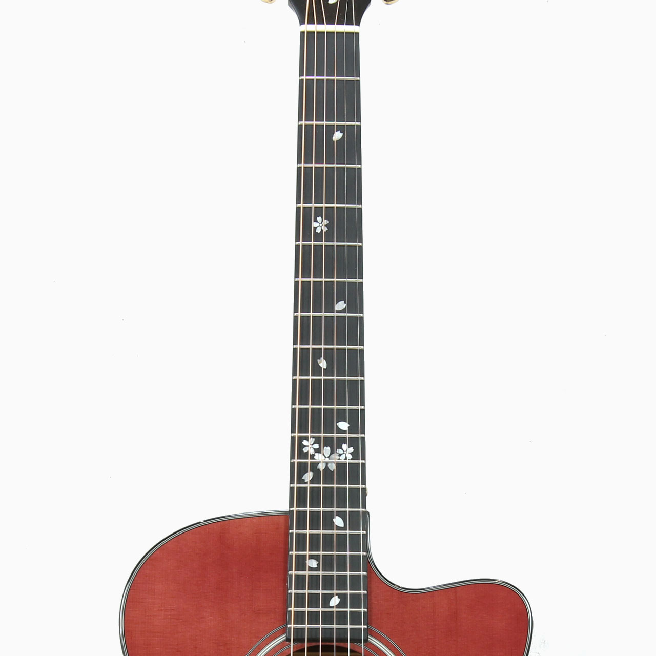 カラーリングは10年以上にわたる桜ギター製造の経験を活かしたシースルーのグラデーションを施し、1本1本個性の違う桜材特有の木肌の魅力を引き立てます。春の季節を代表する風物詩である桜ですが、Headwayではこれまでに「冬桜」や「夏桜」といったそれぞれの季節と桜を掛け合わせた幻想的なデザインのモチーフを生み出し好評を頂いてきました。本モデルにおいてもこれまでにHeadwayが開発してきた四季を表現したカラーリングの中からえり抜いたカラーを踏襲し、既存のギターのイメージにとらわれない楽器を多様性の増す現代の音楽シーンに届けます。ヘッドトップと指板には桜ギターモデルの多くで採用してきた、桜をモチーフとした装飾を施しています。素材には光の反射角や見る角度によってその輝きが変化する天然の白蝶貝を用いており、桜ギターとしての個性を際立たせます。指板材には高い密度を持つミカルタを採用。エボニーにもよく似た黒々とした見た目と、優れた耐久性が特徴です。最大幅が約380mm、最大厚が約106mmの小ぶりなボディは体の小さいプレイヤーでも抱えやすく体にフィットするため、リラックスして演奏に取り組むことが出来ます。ハイフレットへのアクセスを可能にしたカッタウェイ仕様により、コードストローク中心の演奏だけでなく指弾きによるソロギターなど、幅広い音楽表現をお楽しみいただけます。