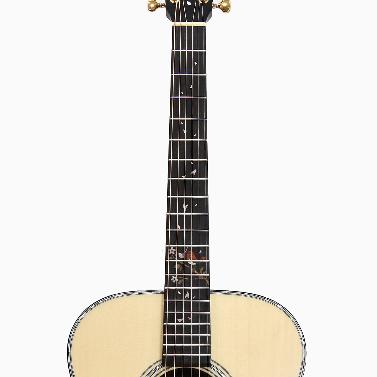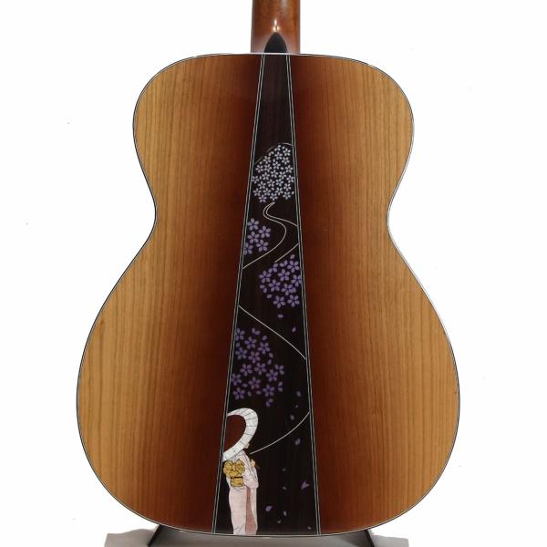 インディアンローズウッド材を据えたボディバックのセンターピースには、千本桜が咲き誇る吉野山と、その道中に佇む和傘の女性をデザインしました。山の上方へと遠く長く連なる千本桜が、春の盛りを表現しています。