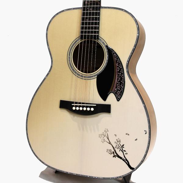 ピックガードには、桜の花びらがヘッドに向かって舞い上がるように散りばめられています。風に乗って花びらが躍動するかのようなデザインで、ギター全体に華やかさと躍動感をもたらします。吉野町で昔ながらの伝統的な技法を守り、1枚1枚手漉き和紙を製造されている福西和紙本舗。現代へ紡がれた伝統的な手漉き和紙を本モデルのサウンドホールラベルに採用しました。吉野千本桜をイメージしたデザインと共に本モデルの価値をより一層高めます。