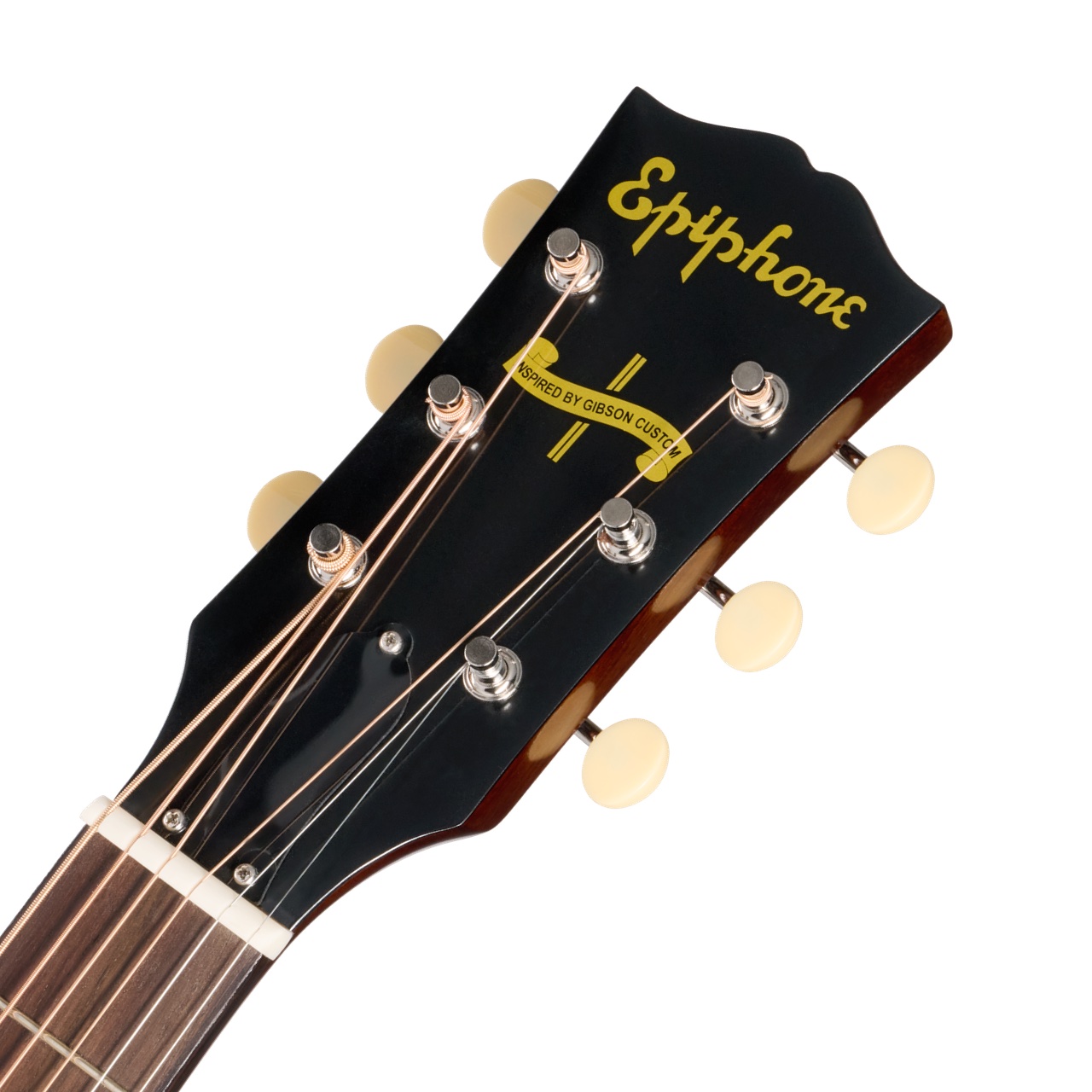ヘッドストックはギブソンの“オープンブック”シェイプを採用。裏面にはInspired by Gibson Customのダブル・ダイヤモンド・ロゴが刻まれ、表面にはエピフォンロゴと「Epiphone Inspired by Gibson」バナーがゴールドのシルクスクリーンであしらわれています。