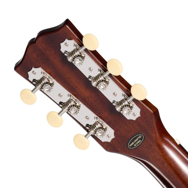ヴィンテージの個体と同様に、クリーム色のボタンを持つ3連タイプのチューナーの背面はオープンバック構造です。ピックガードは初期J-45モデルに見られるティアドロップ形を踏襲し、ローズウッド材のレクタンギュラーブリッジ上には、音程補正のためのコンペンセイテッド・ボーン・サドルを搭載。ナットとブリッジピンは両方ともボーン材です。