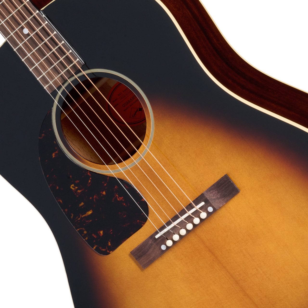 ヴィンテージの個体と同様に、クリーム色のボタンを持つ3連タイプのチューナーの背面はオープンバック構造です。ピックガードは初期J-45モデルに見られるティアドロップ形を踏襲し、ローズウッド材のレクタンギュラーブリッジ上には、音程補正のためのコンペンセイテッド・ボーン・サドルを搭載。ナットとブリッジピンは両方ともボーン材です。