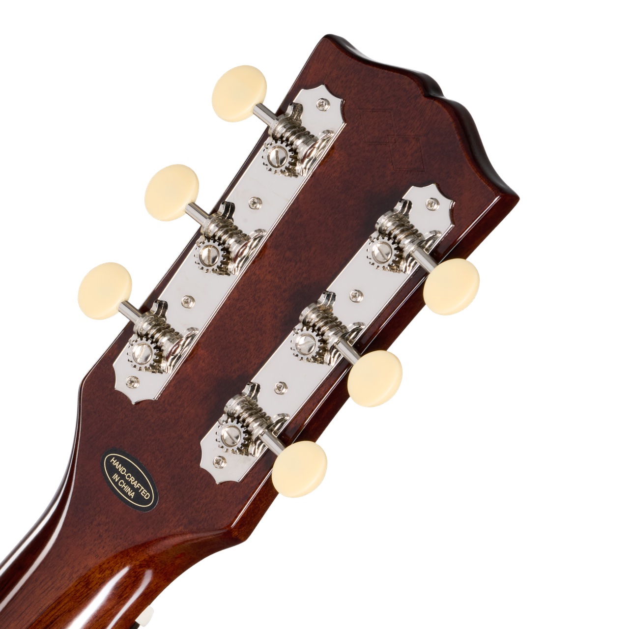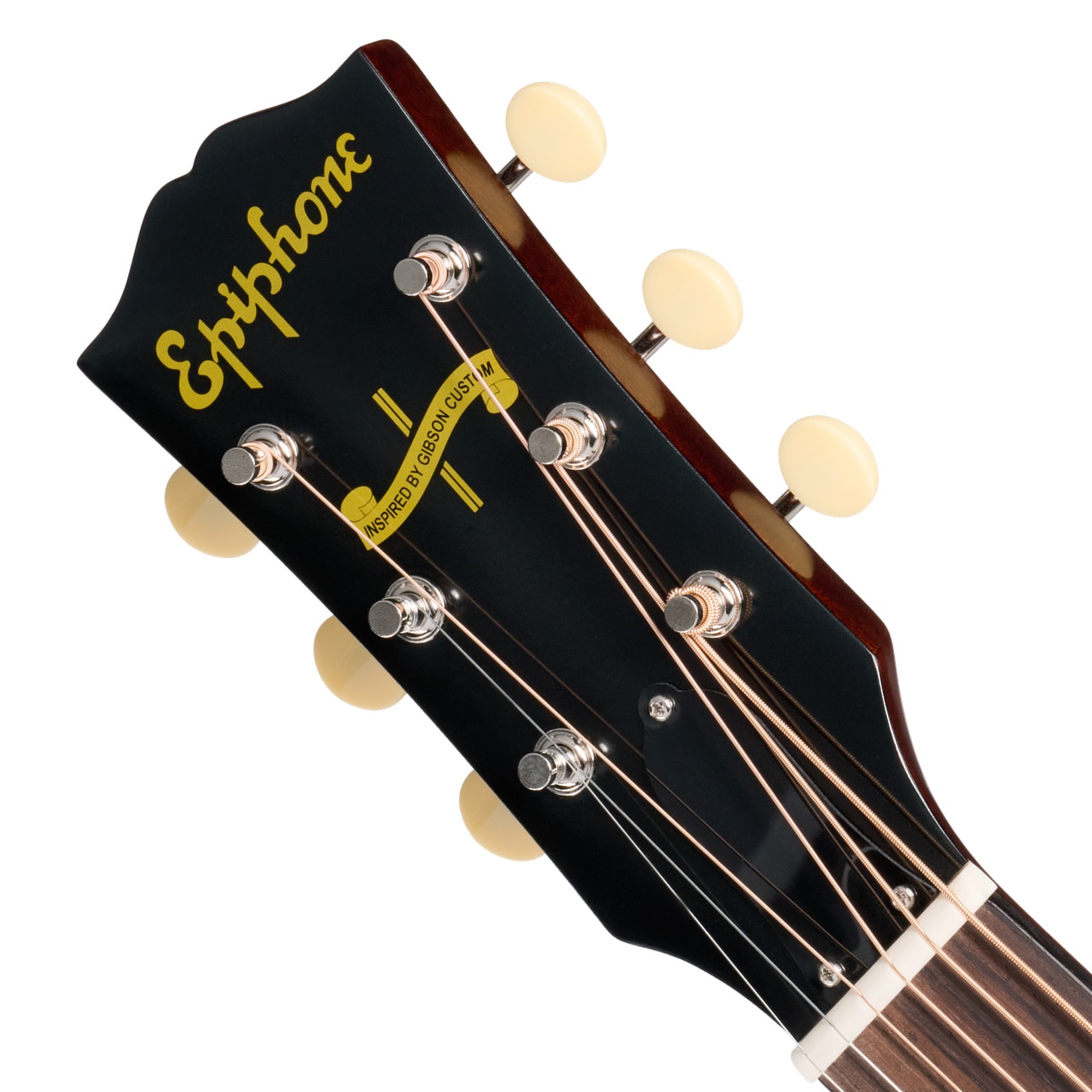 ヘッドストックはギブソンの“オープンブック”シェイプを採用。裏面にはInspired by Gibson Customのダブル・ダイヤモンド・ロゴが刻まれ、表面にはエピフォンロゴと「Epiphone Inspired by Gibson」バナーがゴールドのシルクスクリーンであしらわれています。