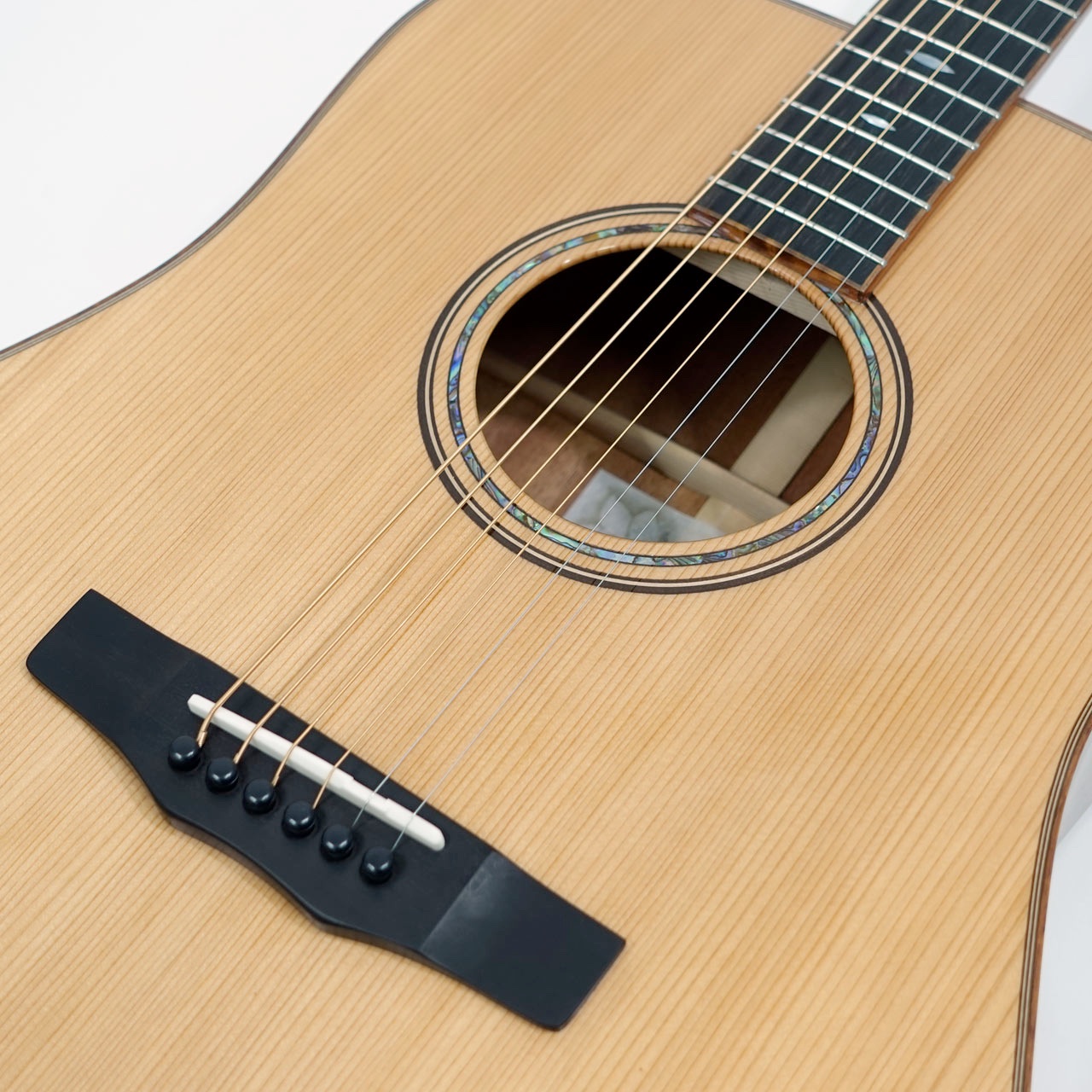 シンプルなスノーフレーク・ポジションマークやウッディなバインディングなど落ち着きのあるルックスに仕上がっています。その他エボニー指板・サドルや牛骨ナット、サドル、GOTOH製のペグなどスペックも上々。