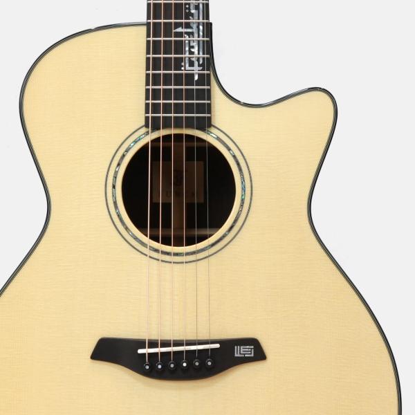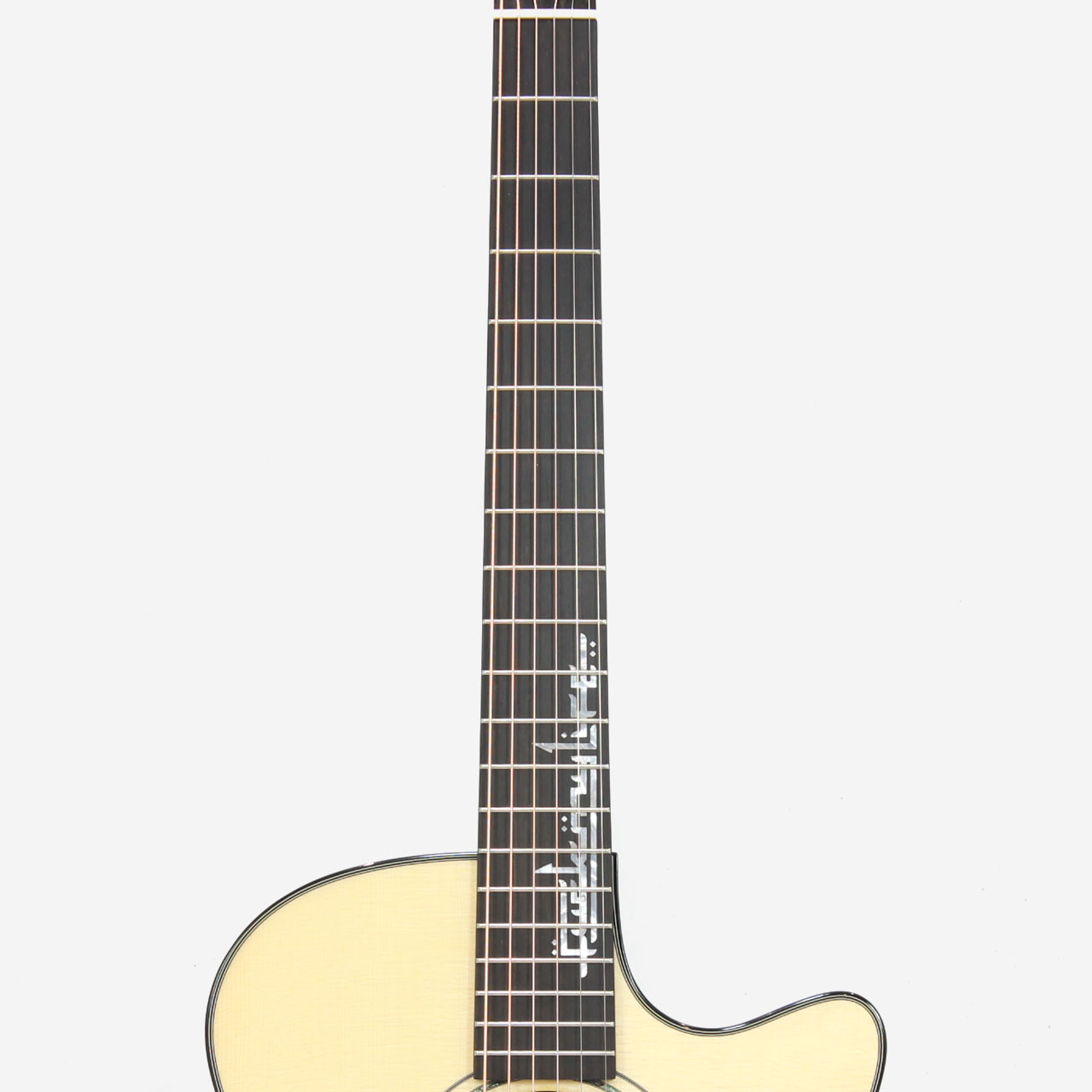 ナチュラルフィニッシュを元に、ボディ表裏のダブルコンターやAAAグレードのイングルマントップなど、FG01の基本スペックを踏襲しつつ、リーズナブルな価格を実現しています。オリジナルデザインのインレイは、UK氏の座右の銘が刻まれております。