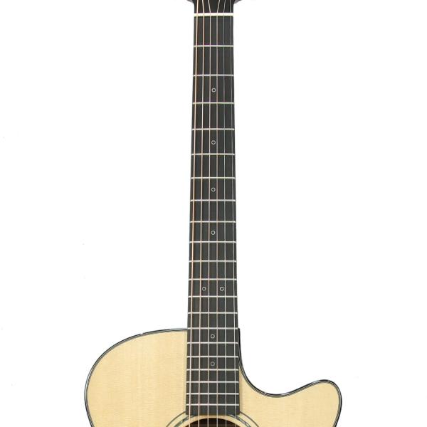 本器はフォルヒのラインナップの中でスタンダードシリーズに位置するイエローシリーズのGc-SR。グランドオーディトリアム・ボディにカッタウェイ、シトカスプルースとインドローズの組み合わせとなっており、フォルヒギターでもシダートップ仕様のGc-CRと人気を二分するモデルです。