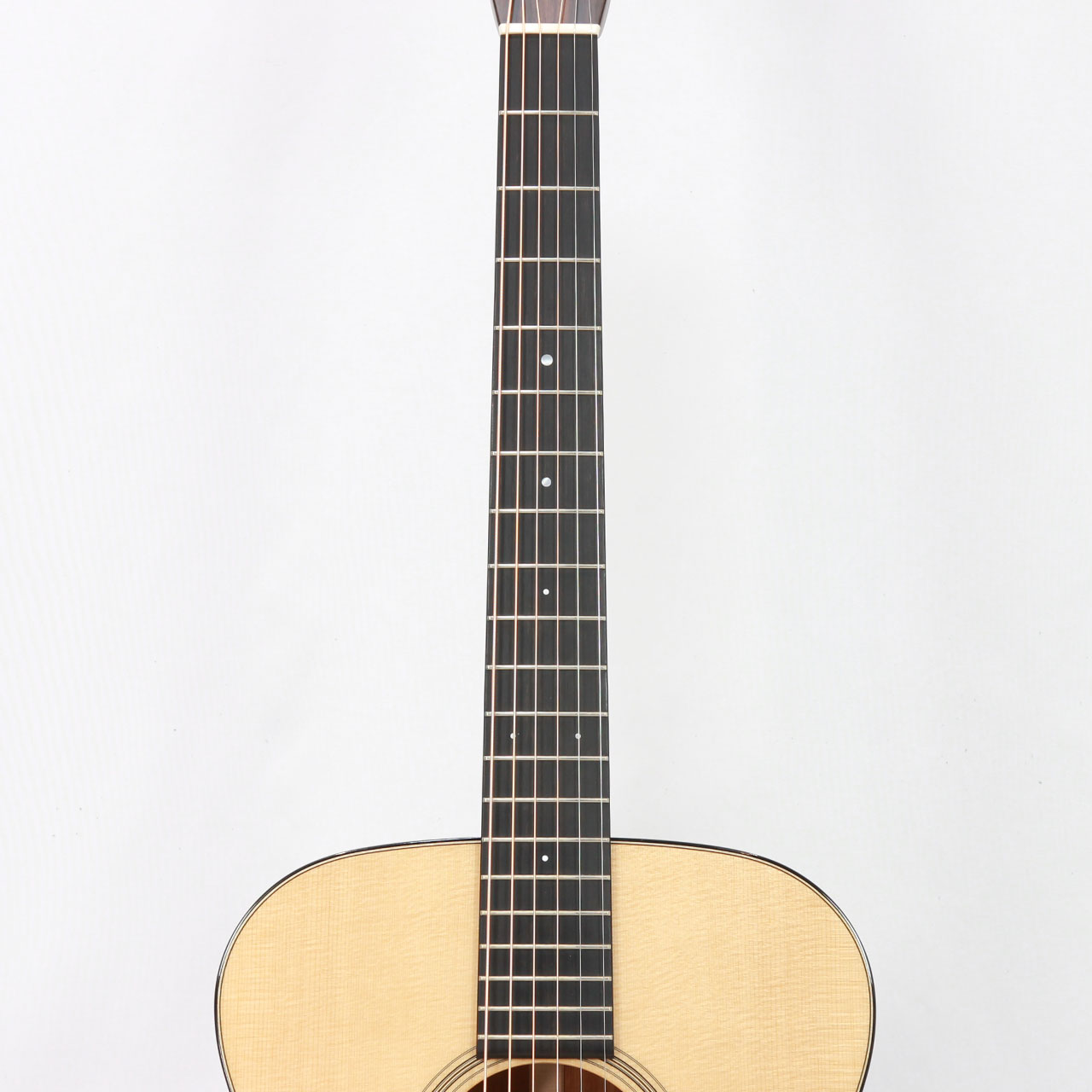 非常にバランスの良い個体で、タイトな6弦の低音鳴りから5.4.3弦は広がりと押し出しの強さを持っており美しくブーストされた中音域が気持ち良く、2.1弦のプレーン弦は硬めで霞まずしっかりと伸びます。OMの18スタイルでここまで色彩豊かに鳴ってくれるギターはこの価格帯では非常に希少だと思います。