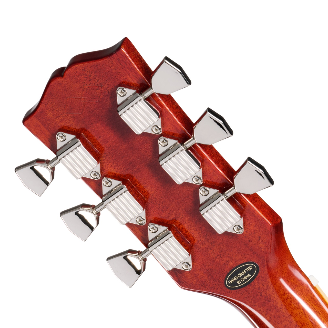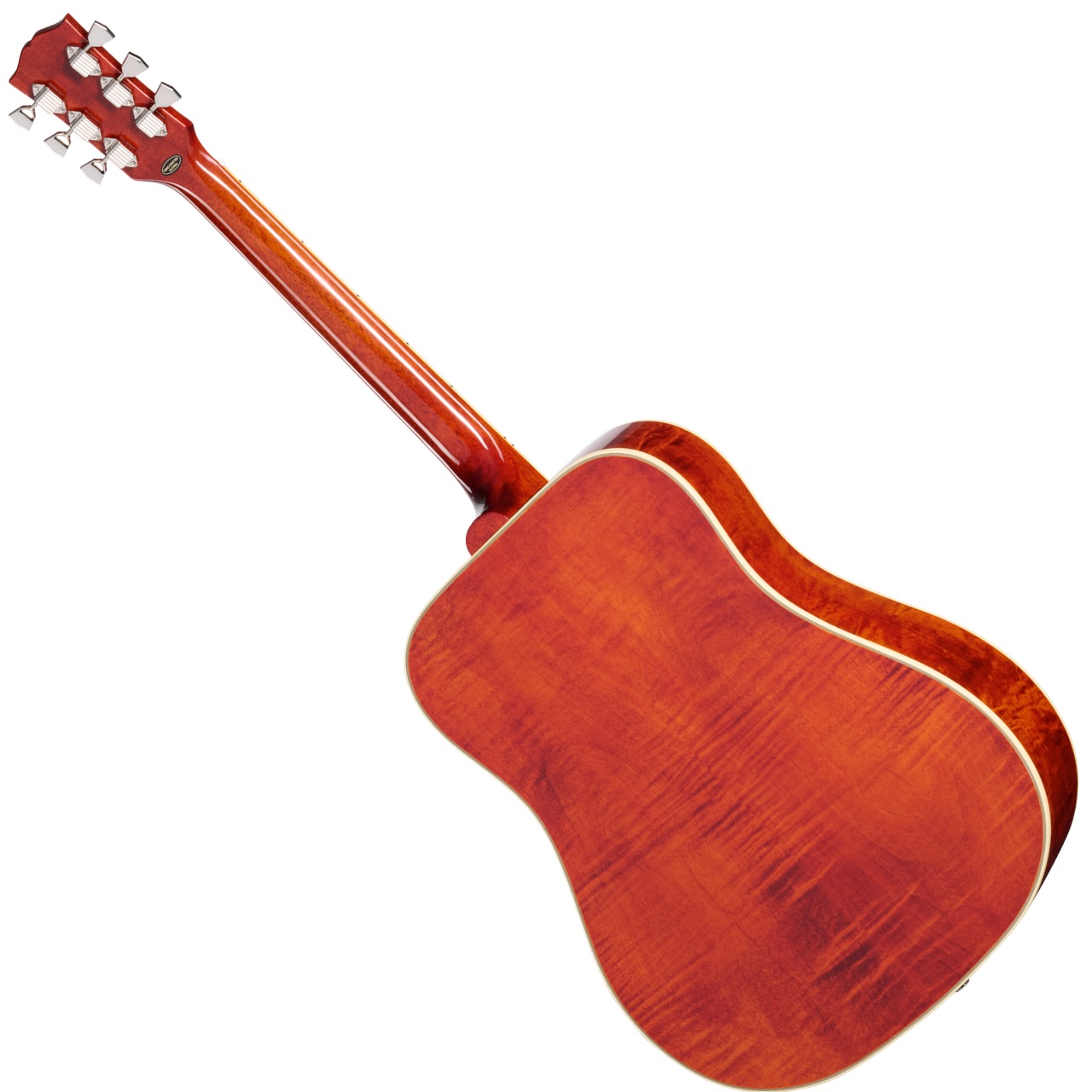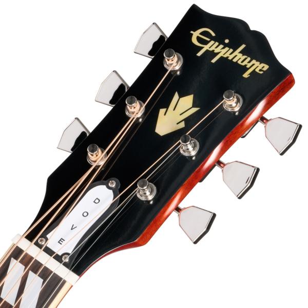 ヘッドストックについて、Kluson®のワッフルバック・チューナー(メタル製キーストーンボタン付き)を装備し、安定したチューニングを実現しています。ヘッドストックには2層のトラスロッドカバーが取り付けられ、「DOVE」の刻印が施されています。Epiphoneロゴとギブソンのクラウンインレイはエイジド・マザー・オブ・パールであしらわれています。ヘッドストック形状はギブソンと同様の“オープンブック”スタイルで、裏面にはInspired by Gibson Customのダブル・ダイヤモンド・ロゴが刻まれています。