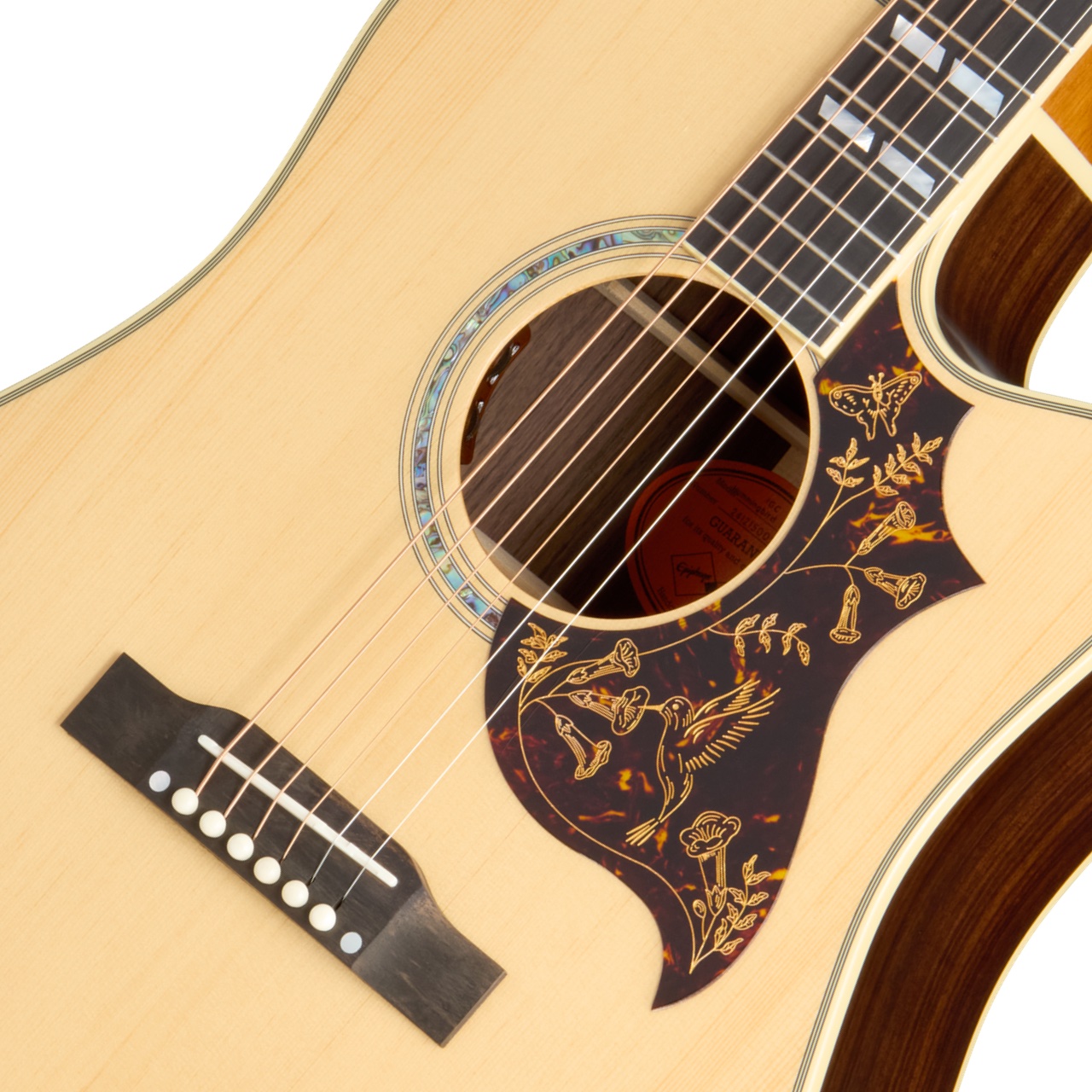 ピックガードはアクリル&セルロイドのサンドイッチ構造で、ゴールドで刻まれたHummingbirdのグラフィックが特徴です。ナット、コンペンセイテッドサドル、ブリッジピンはボーン材で、アップベリー形のエボニー材のブリッジはギブソンのモデル群と同デザインです。