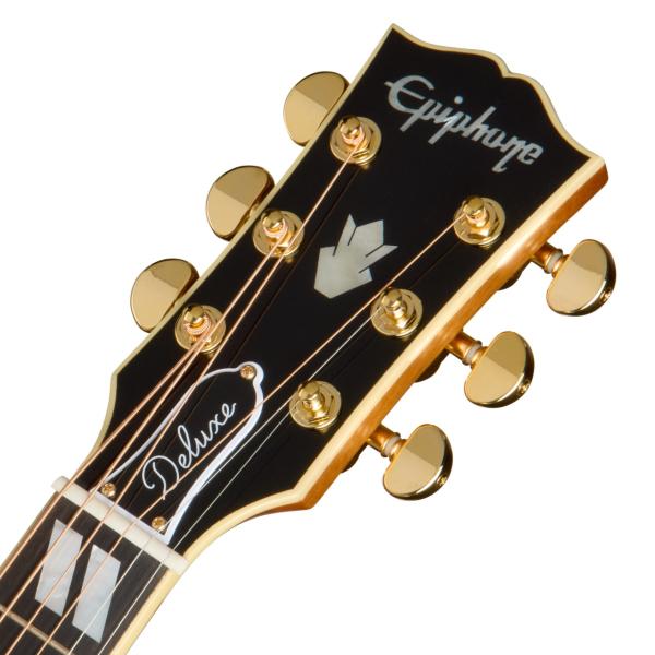 ボディ・トップには6層、バックには4層のバインディングが施され、指板とヘッドストックには1層のバインディングが施されています。ゴールドハードウェアが高級感を演出し、精度の高いGrover Rotomaticチューナーはギブソン伝統の“オープンブック”ヘッドストックに取り付けられています。サウンドホール部にあしらわれたロゼットにはアバロンがふんだんに使用され、ヘッドストックにはEpiphoneロゴとギブソンのクラウン・インレイがマザー・オブ・パールであしらわれています。