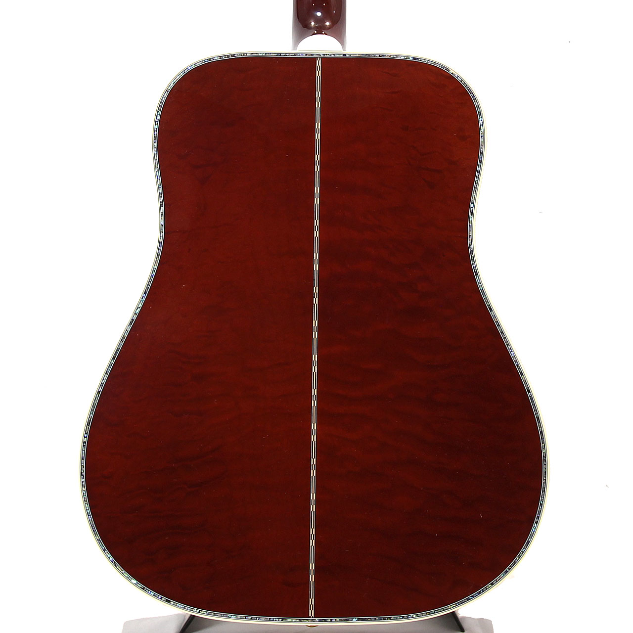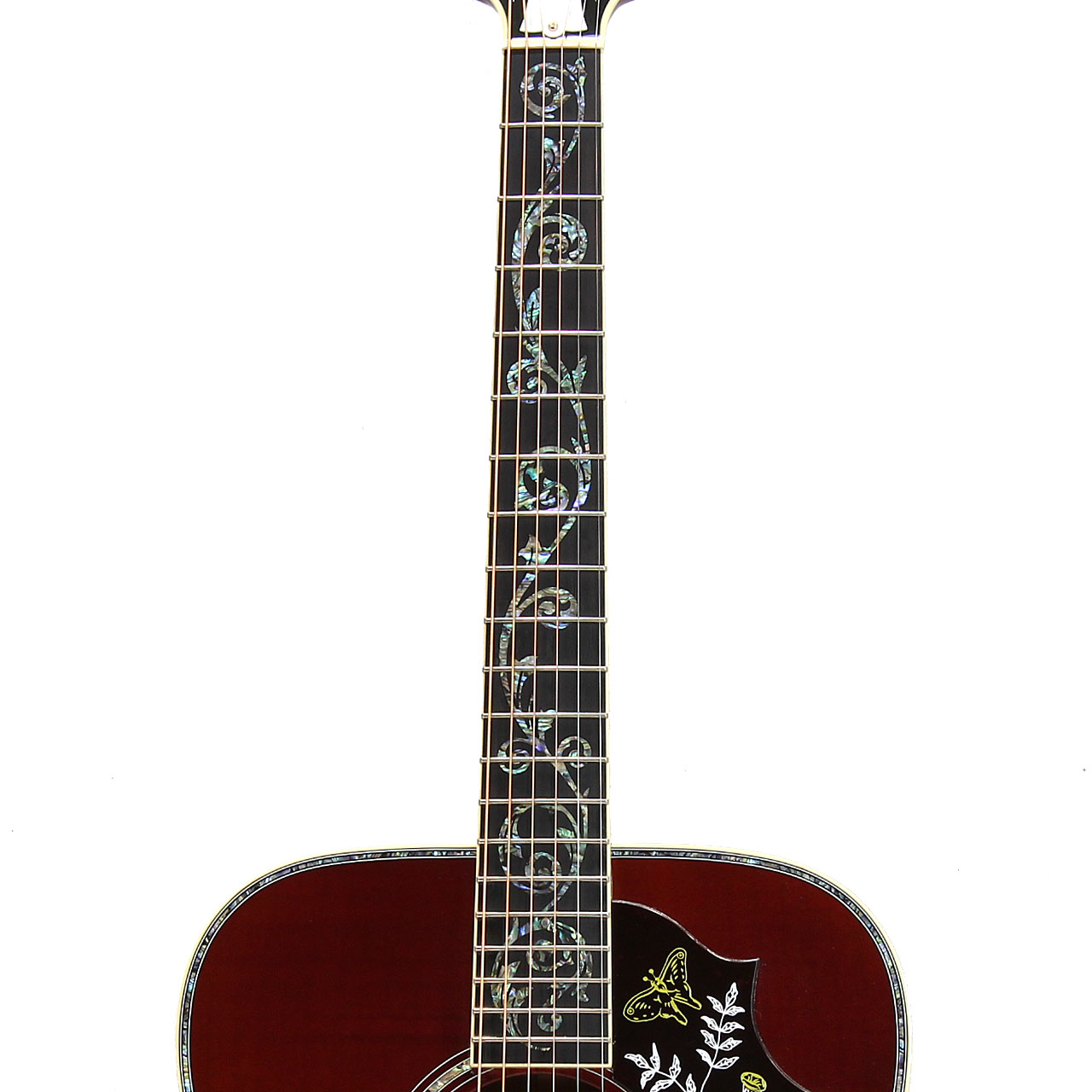 ボディバックのキルト杢は、数ある買い付け品の中でも群を抜いて美しく、光の当たり方で表情を変える様はまさに芸術品。ヘッドから指板まで続くアバロンのツタ模様や、マザーオブパールのロッドカバーといった豪華な装飾を、最高級のウッドマテリアルがより一層引き立てています。担当者が最も惚れ込んだのが音の分離感でこちらの個体は低域から高域までまとまりのあるバランスの良い鳴りが際立っておりコード弾きやフラットピッキングとの相性は抜群。余分な低音のボワつきも無く、適度な分離感もある為カッティングの歯切れの良さはかなりのもの、ブラッシング音までパーカッシブな心地よさがあります。スクエアショルダーの骨太な鳴りはそのままにメイプルによる繊細さも持ち合わせたきめ細かい音像。ハミングバードと言えば太いアタック感と丸みのある音色のハニートーンが魅力ですがウルティマはよりエッジの効いたシャープなサウンドと言えます。