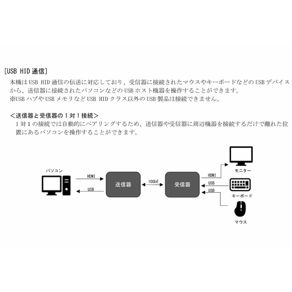 ・USBのHID クラス相当 Type-A 2 系統 を延長・切替可能。