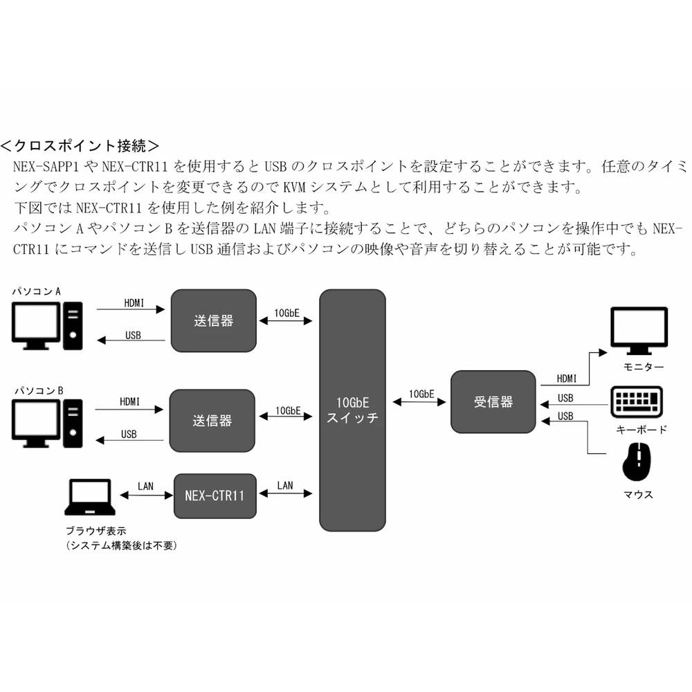 映像信号や音声信号の他に、USBと1000BASE-T までのLAN を伝送できるほか、NEX-SMART 用のコントローラーやアプリケーションおよび