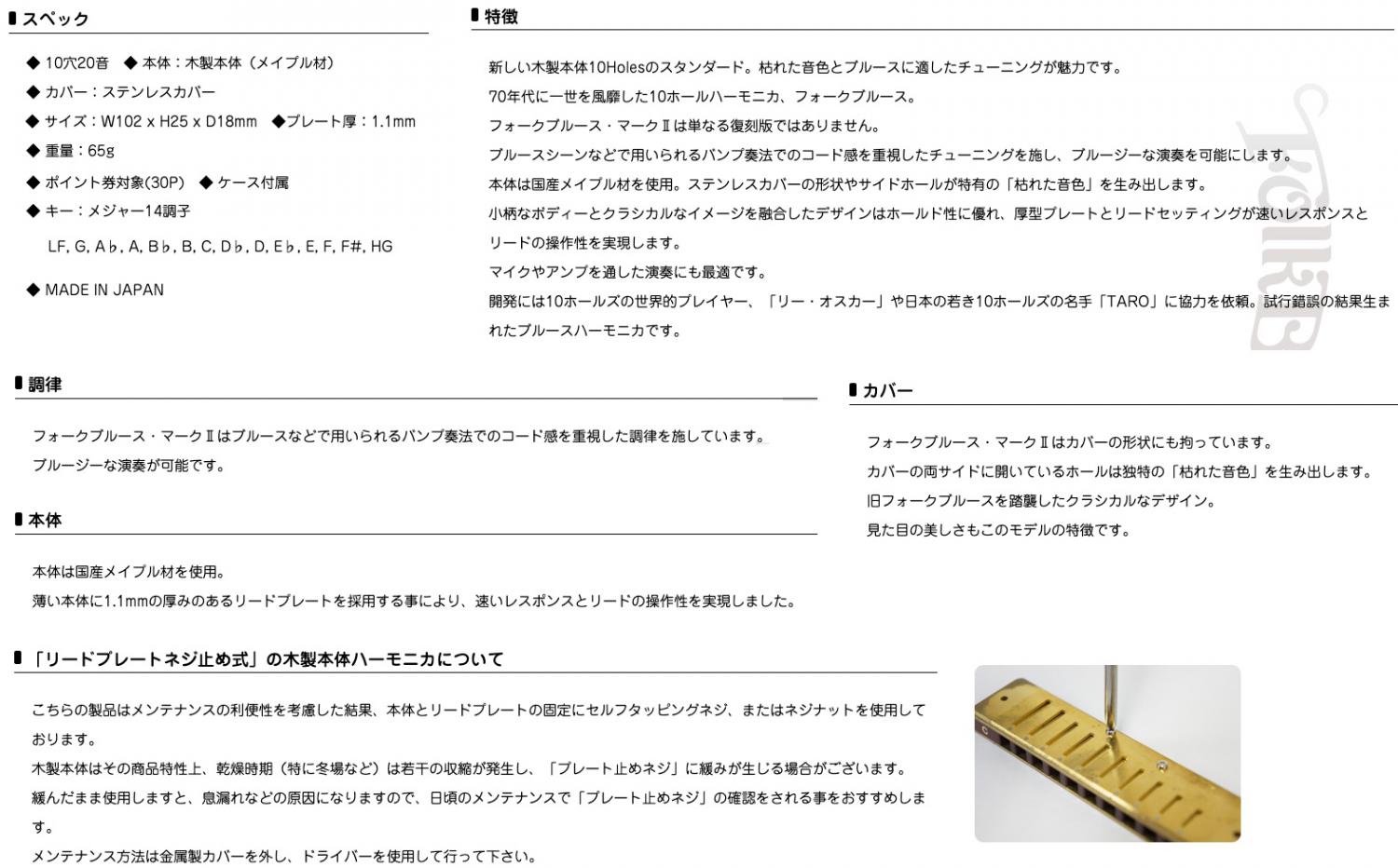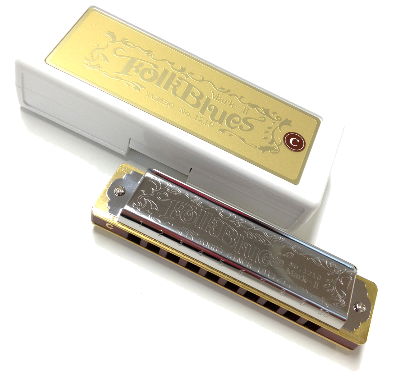 マイクやアンプを通した演奏にも最適です。開発には10ホールの世界的プレイヤー、「リー・オスカー」や日本の若き10ホールズの名手「TARO」に協力を依頼。試行錯誤の結果生まれたブルースハーモニカです。旧FolkBluesを踏襲したクラシカルなデザイン。見た目の美しさもこのモデルの特徴です。 TOMBO FolkBlues Mark-II Blues Harmonica トンボ No. 1210 フォークブルース・マークII ブルースハーモニカ