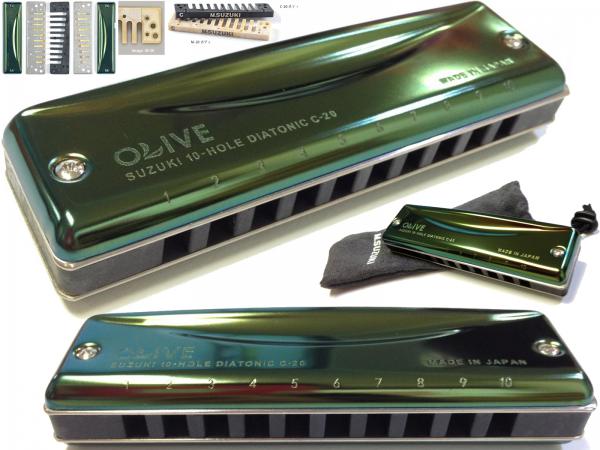 SUZUKI スズキ オリーブ F♯ OLIVE C-20 グリーン 10穴 ブルースハーモニカ テンホールズ ハーモニカ ステンレスカバー Fシャープ メジャー日本製 10holes blues harmonica green harp 20音