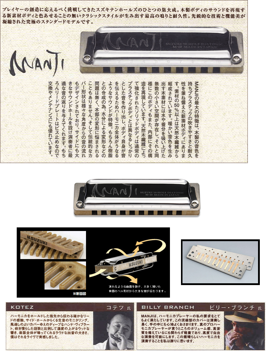 鈴木ハーモニカの中では比較的新しいラインナップのテンホールズハーモニカ。ボディは木製の音色を持ち、プラスチックの吹きやすさと耐久性を兼ね備えた新素材。50%は天然木繊維から組成されています。暖かい音色を生み出す木素材には、水や養分を吸い上げた無数の小さい空間が存在します。それと同様にこのボディもまた、内部にその構造を再現しています。(※断面図)天然木繊維によって強化されたソリッドボディは通常のプラスチックボディとは異なるしっかりとした音を作り出し、ボディ自身が音を伝えるためハーモニカ全体がうなるようなサウンドが特徴です。もちろん樹脂との合成の為、水分による変形などの問題は無く、木部の変形に悩まされることもありません。またカバーはブルース・ロックハーモニカ奏者の要望に答える、背面が全て開いたカバースタイル。様々な角度からの音の流れもデザインされています。サイドにも大きなサウンドホールを設け、演奏者に最適な音の返りを与えます。プロプレイヤーと試行錯誤を繰り返し、伝統的なカバー形状に絶妙なホールド感と音抜けを実現しています。リードプレートは研究、技術、設備により誕生したリードプレートです。リード弁とプレート窓の取付精度を限界まで高めたオーバーブロウにも定評のあるこのプレートはダイナミックレンジの広い粘りのある音が特徴。さらに、吹き込むほどに演奏者に唄うように答えてくれます。 SUZUKI MANJI M-20 Blues Harmonica スズキ マンジ テンホールズハーモニカ M20