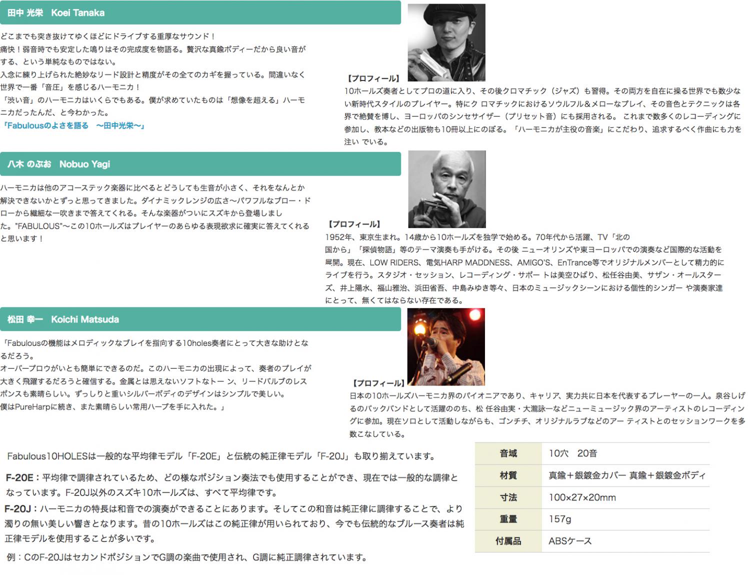 F-20Jとの違いは平均律で調律されていることです。どの様なポジション奏法でも使用することができ、現在では一般的な調律となっています。ちなみにF-20J以外のスズキ10ホールズはすべて平均律です。